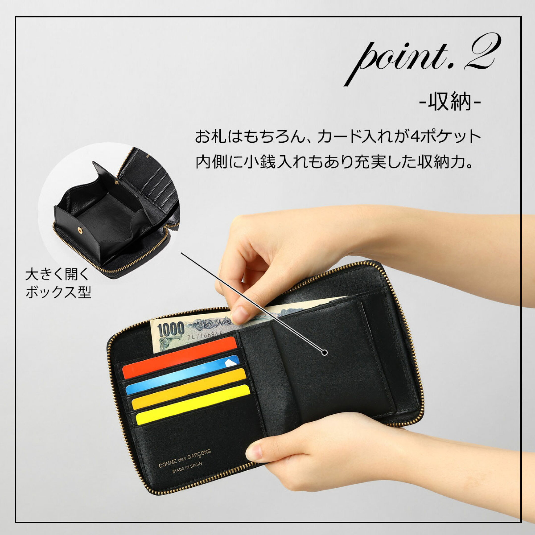 上着やカバンのポケットに収まるコンパクトサイズ。お札はもちろんカード入れが4ポケットと大きく開くボックス型の小銭入れもあり充実した収納力です。