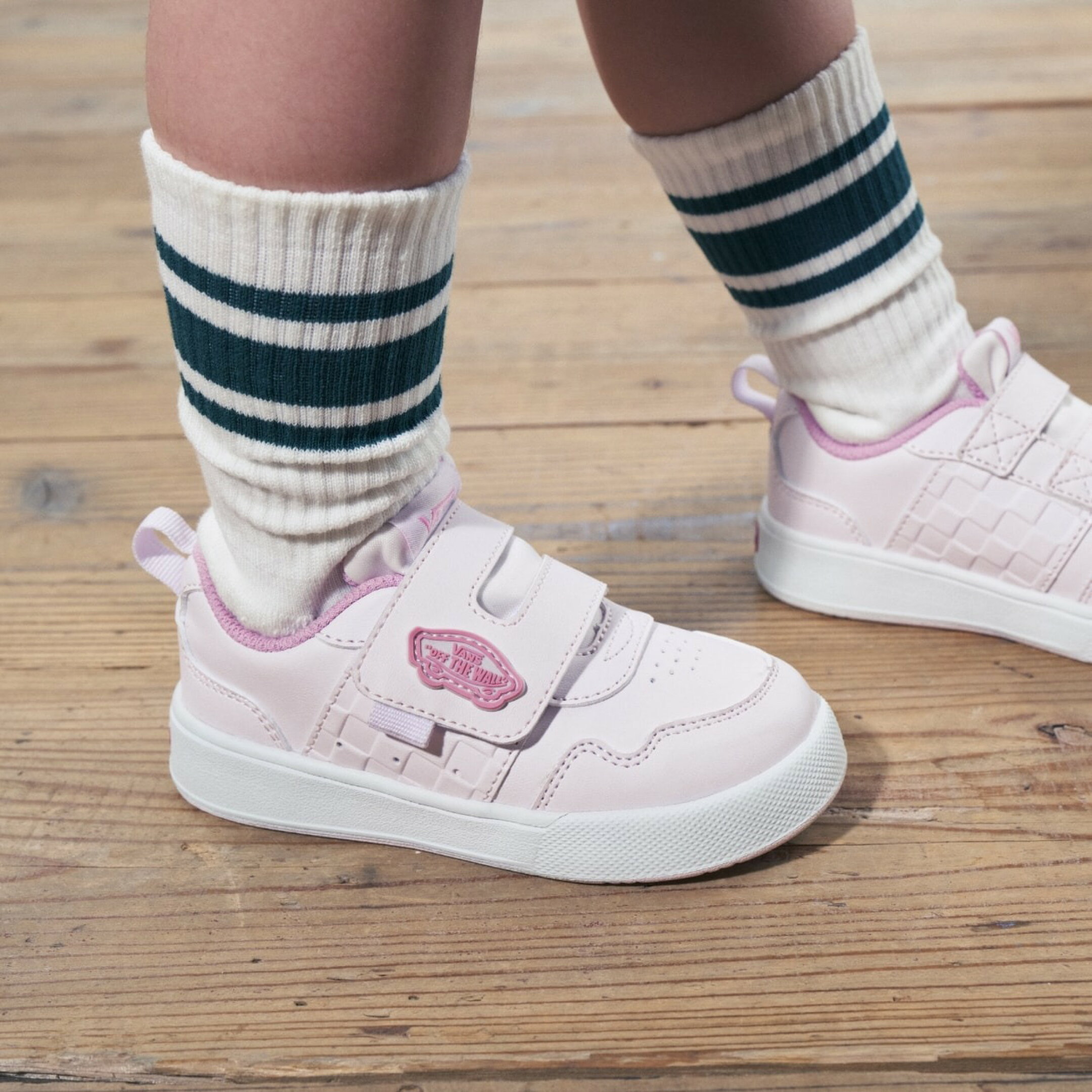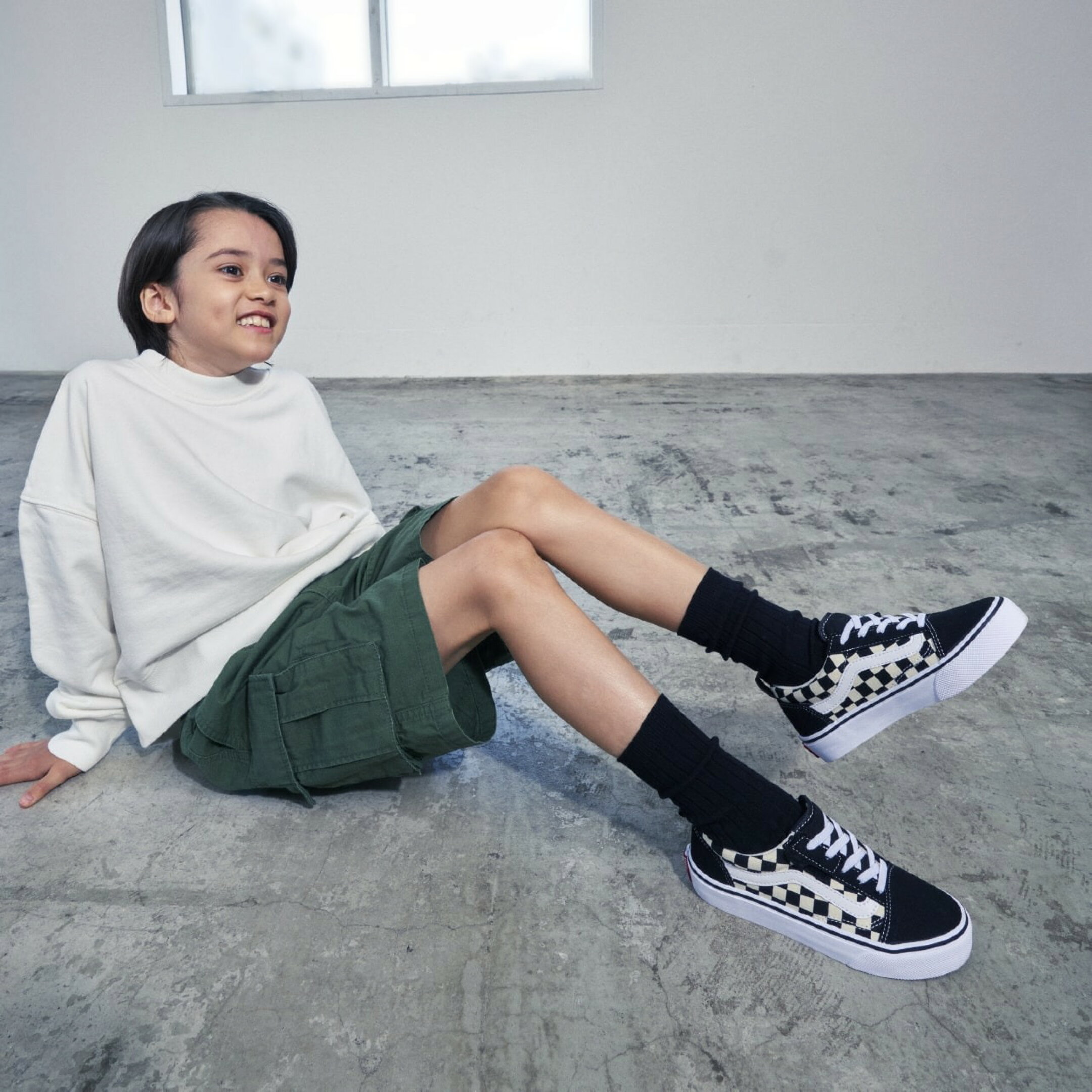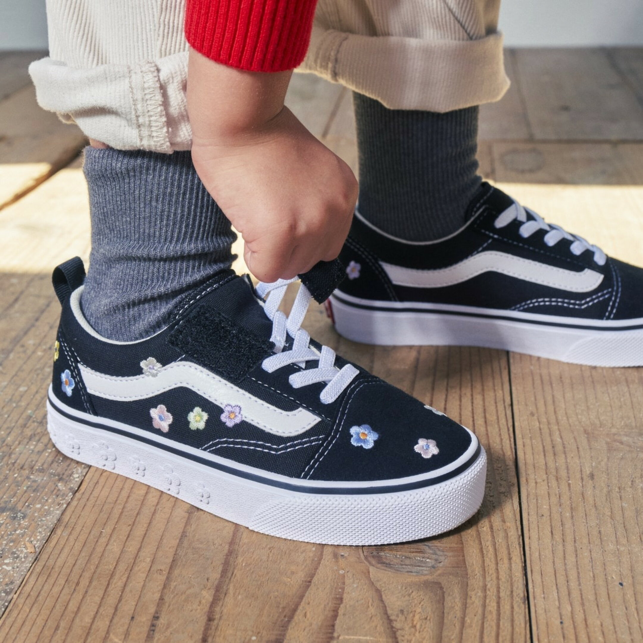 脱ぎ履きがしやすいよう、履き口にベルトストラップを使用。 柔らかいソールやゴム製のシューレースなど、VANSのいつものシルエットはそのままに、 キッズに優しい機能を多数搭載。