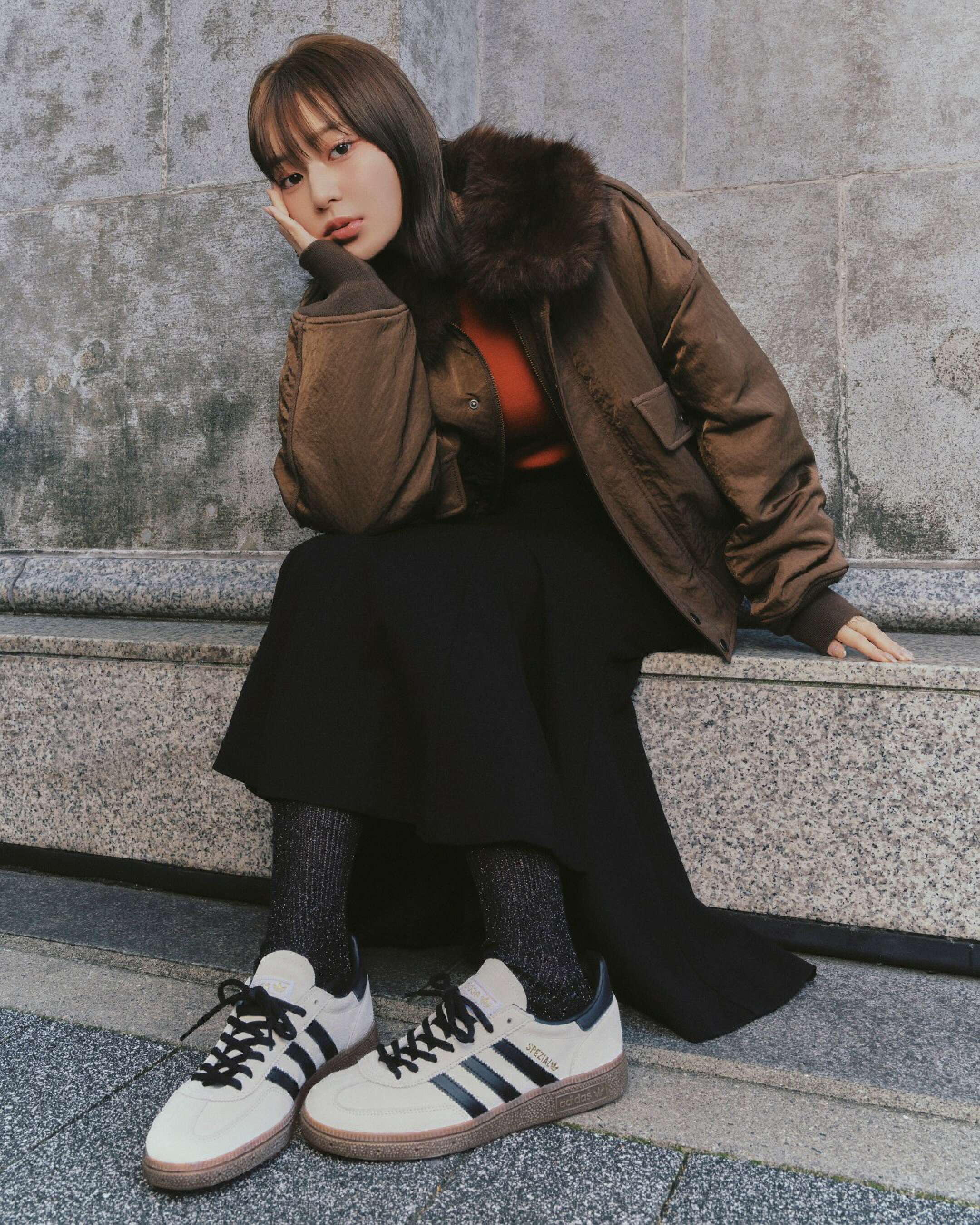 ニュートラルカラーの〈SPEZIAL〉が、冬コーデの“抜け感”をつくる。 鮮やかな赤のトップスを纏っても、足元がしっかりと受け止め、ダークトーンのアイテムと自然に馴染む。 オーバーサイズアウターとタイトスカートのコントラストが、〈SPEZIAL〉のクラシックなフォルムをよりシャープに見せ、 カジュアルとフェミニンの両方に振れる万能さを際立たせる。