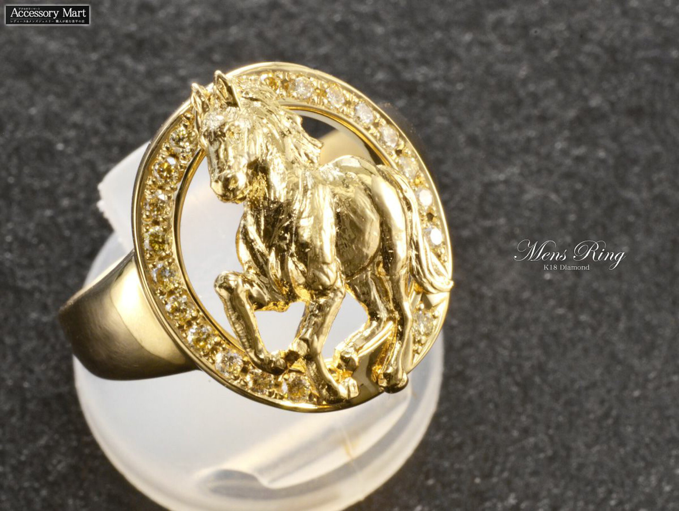 指輪 メンズリング 18金 K18 18K ダイヤモンド 馬 ホースモチーフ イエローゴールド 艶消し 男性 刻印入り ごつい 太め 幅広 30代 40代 50代