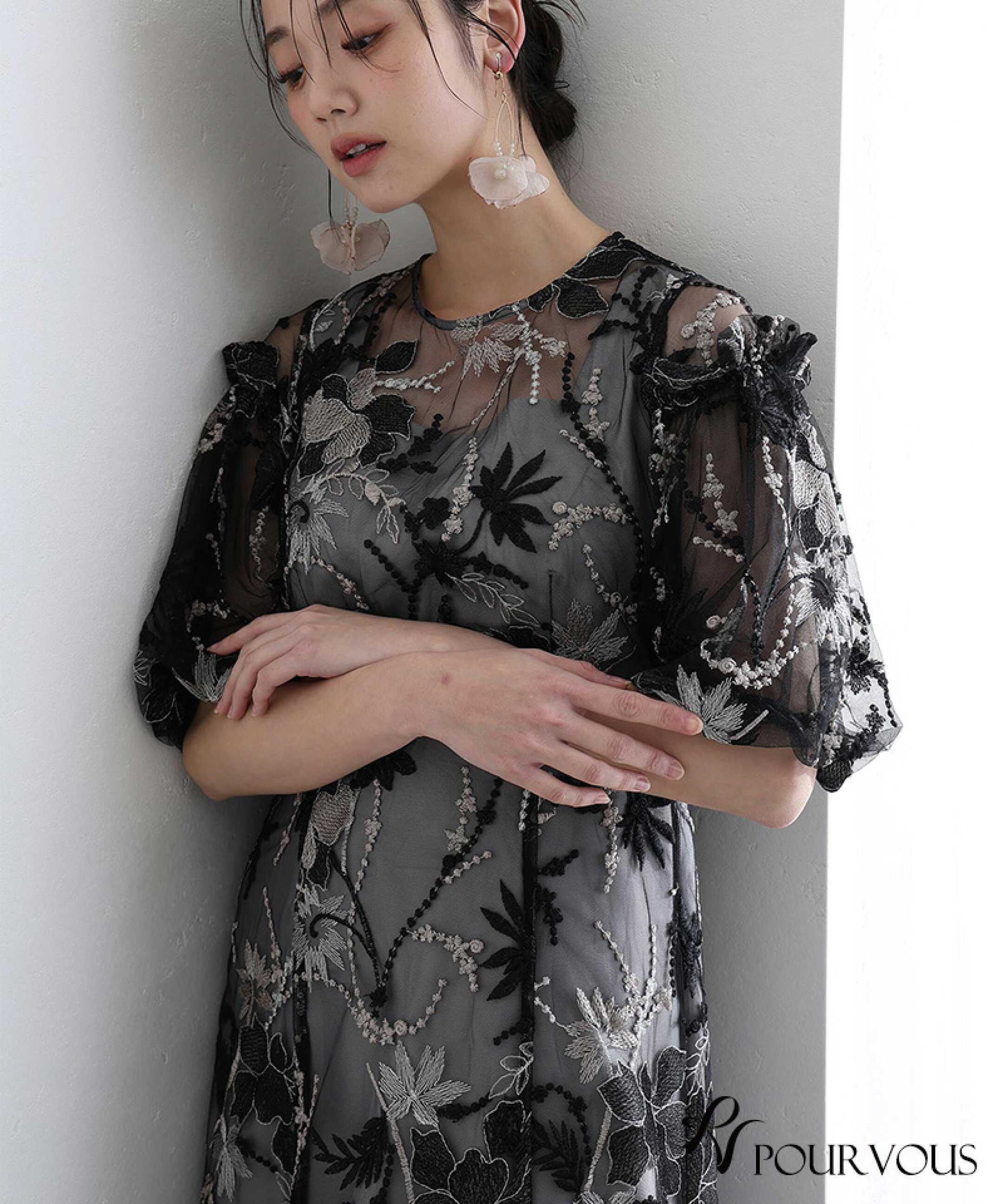 刺繍レースが華やかなパフスリーブドレス
