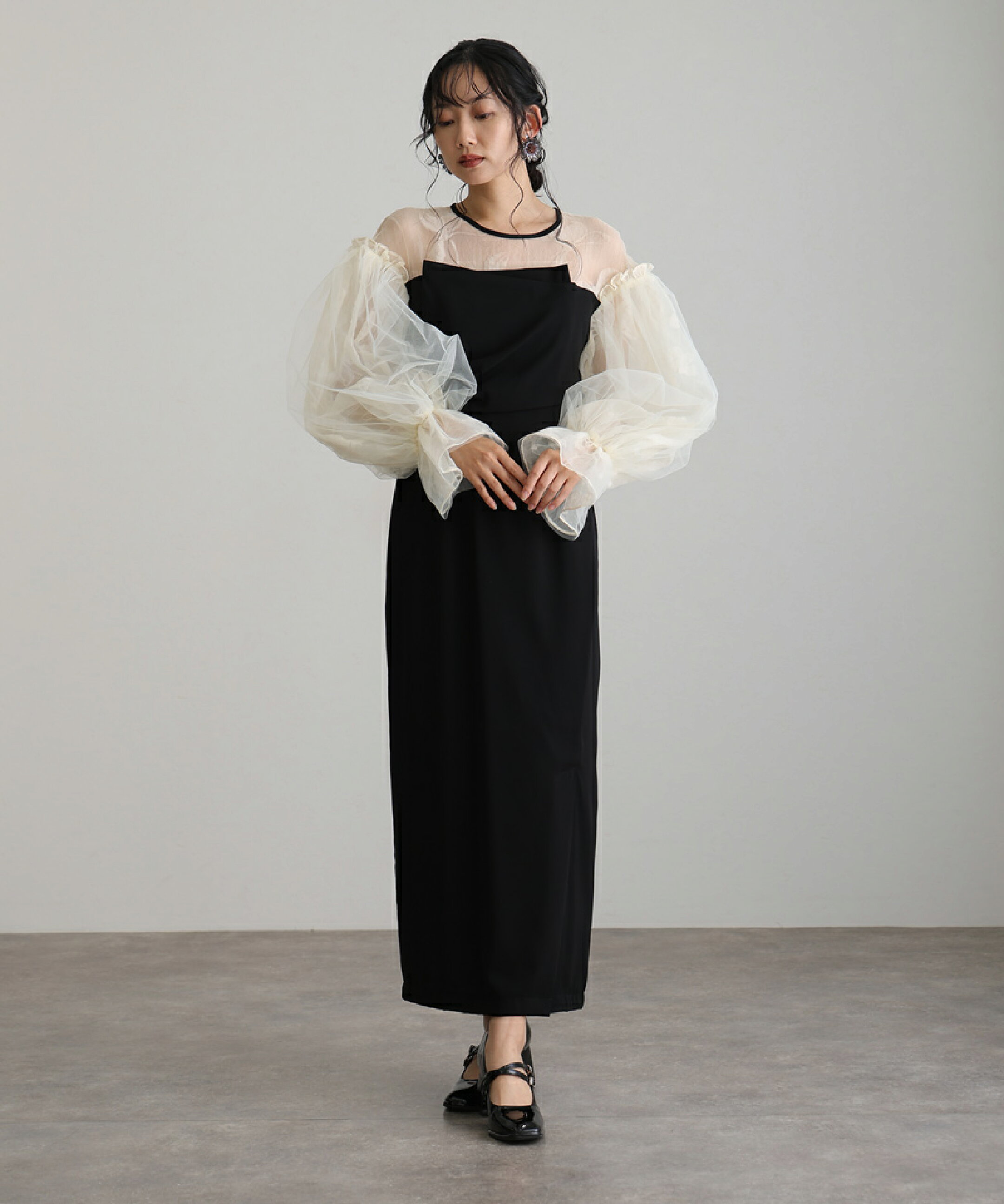異素材ミックスの上品なデザインが目を引くIラインワンピースドレス。 ボリューム感のあるチュールスリーブがトレンド感を添えつつ、華奢見えを演出します。 結婚式やパーティー、フォーマルシーンに映える華やかさが魅力です。