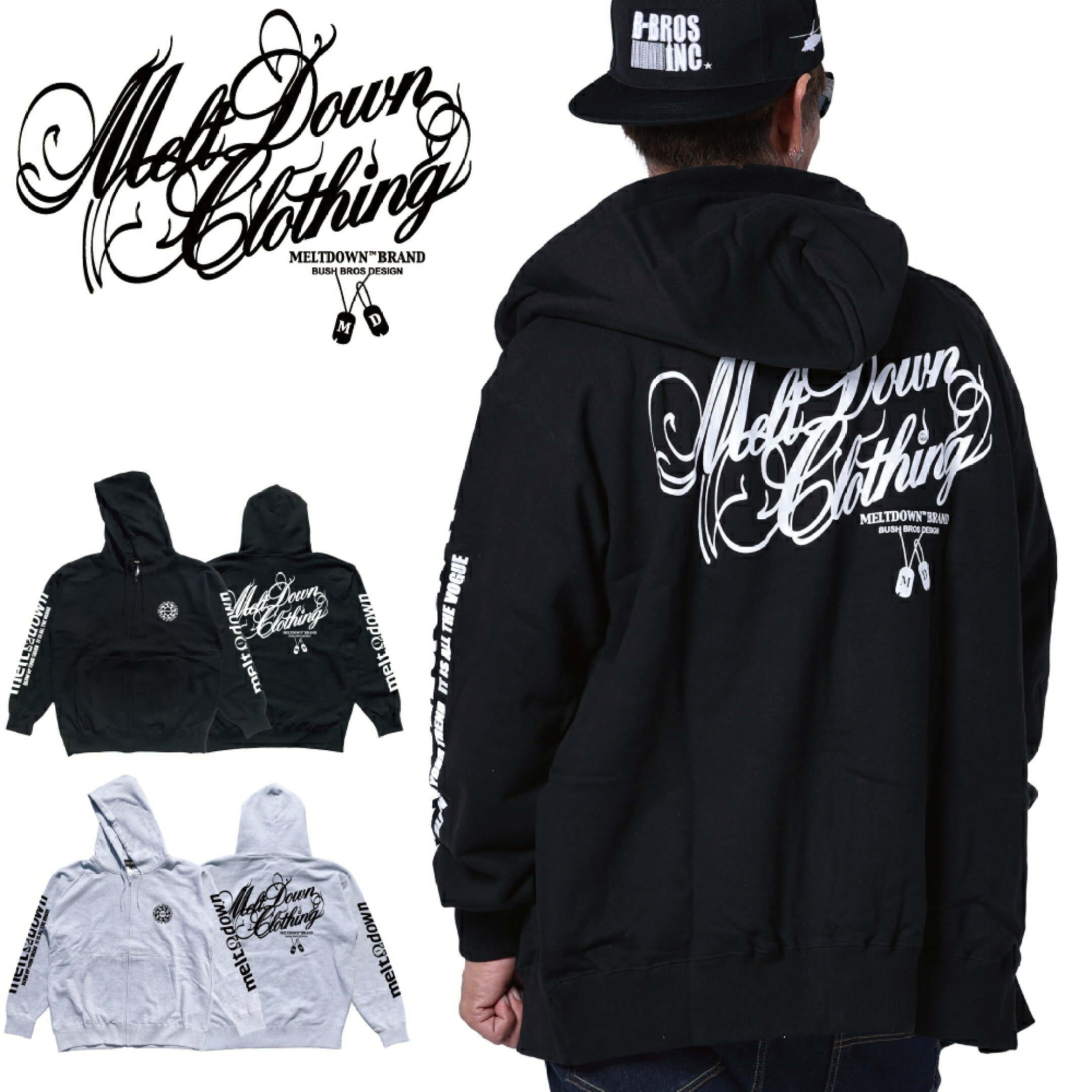 【ドラマ着用商品】MELTDOWN(メルトダウン) ジップスウェットパーカー SCRIPT ZIP HOOD SWEAT(MD-SWJK01) メンズファッション ヒップホップ B系 ウェッサイ ローライダー 西海岸 車 ラッパー ストリート系 フード スクリプト ロゴ ラインストーン 袖プリント 大きいサイズ