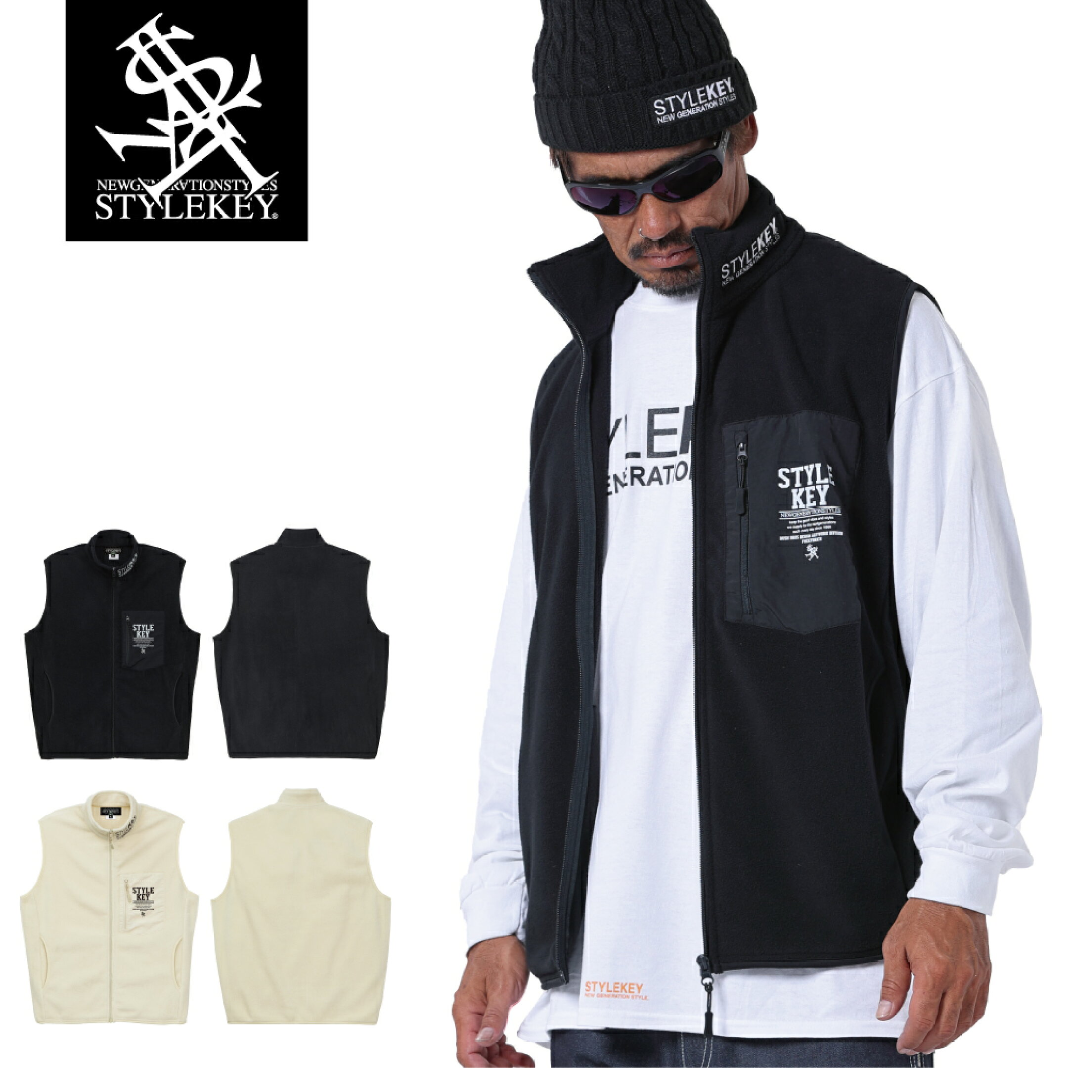 STYLEKEY(スタイルキー) フリースベスト WARM UP FLEECE VEST(SK24FW-FVST01) マイクロフリース 刺繍 ロゴ プリント アウター ワンポイント 立ち襟 メンズ ファッション ストリート系 B系 ヒップホップ 軽量 暖かい 袖なし ノースリーブ スタンドカラー