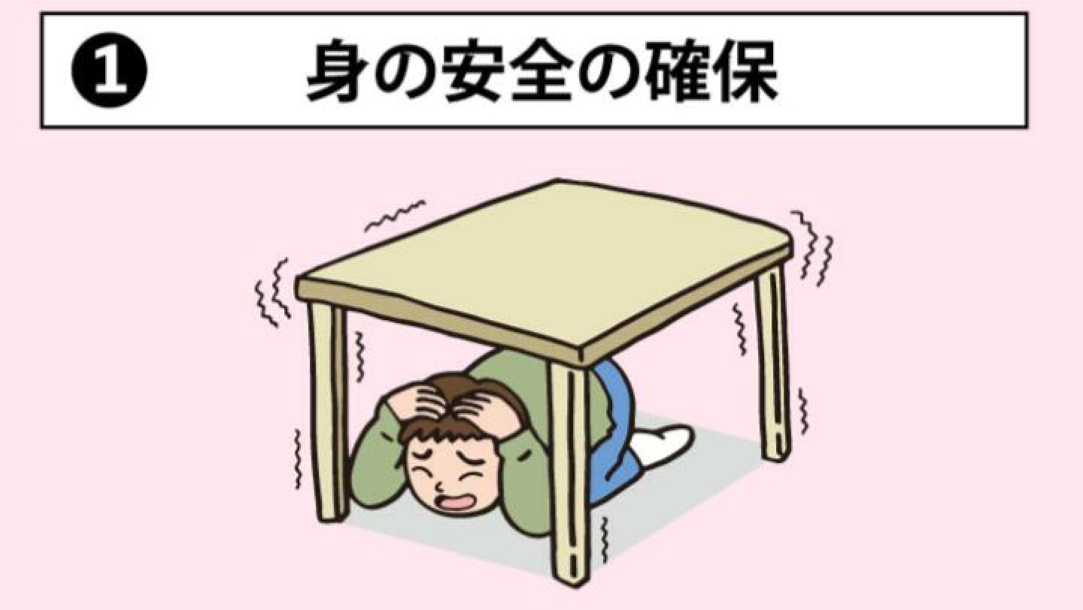 ~自宅にいるとき~ 【1.身の安全の確保】 落下物や転倒物から離れ、体を守る姿勢を。キッチンなどで火を扱っていても無理に火を消しに行かず、まず、身の安全を第一に行動しましょう。 【2.一度、 揺れがおさまったら火元の始末と出口の確保】 いったん揺れがおさまったら、火元を確認し、家族の安全や室内の被害を確認しましょう。 また、足元に落ちているガラスや飛散物に注意しましょう。 【3 避難が必要なのか判断】 津波や火災、建物などの倒壊の恐れがある場合は、すぐに避難します。 避難前にブレーカーのスイッチOFFや、ガスの元栓もしめ、戸締りなども確認しましょう。 ~屋外にいるとき~ 【道路やビル下を歩いているとき】 ブロック塀の倒壊や物の転倒などに注意し、これらのそばから離れましょう。 ※ビル、看板や割れた窓ガラスなどの落下に注意 【鉄道・バスに乗っているとき】 つり革や手すりにしっかりつかまりしょう。 【店舗などの集客施設にいるとき】 その場で頭を保護し、揺れに備えて安全な姿勢をとって、 吊り下がっている照明などの下から退避しましょう。 ※あわてて出口や階段に殺到しない 【エレベーターに乗っているとき】 最寄りの階で停止させ、すぐに降りましょう。 【自動車を運転中しているとき】 あわてて急ハンドルや急ブレーキをかけ ず緩やかに速度を落としましょう。ハ ザードランプを点灯し周りの車に注意 を促し、道路の左側に停止しましょう。 【山やがけ付近にいるとき】 落石やがけ崩れに注意し、できるだけその場から離れましょう。 ~大都市で地震に遭遇したとき~ 道路では余震で頭上から物が落下してきたり、火災が起こって いたりなど、危険が予想されます。 ▼▼▼ まずは、身の安全を確保! ▼▼▼ 安全な場所からはむやみに移動しないようにしましょう。 大混雑している場所では、人が将棋倒し、集団転倒が起きやすくなるので近づかないようにしましょう。