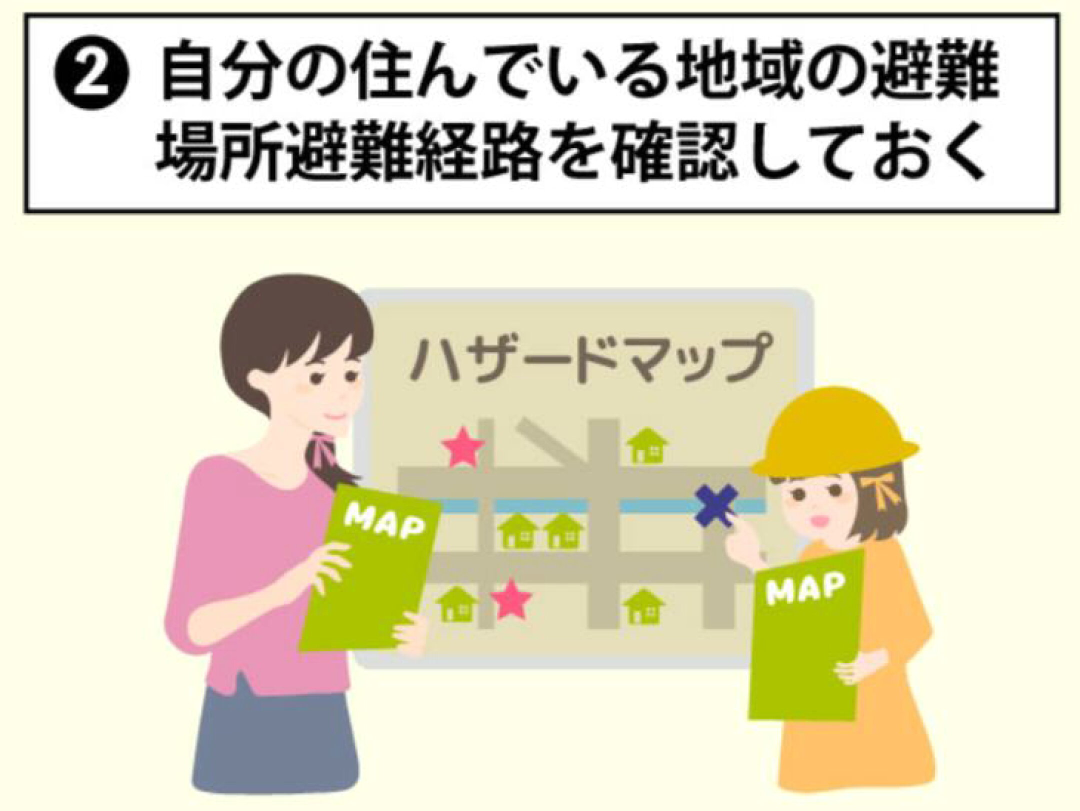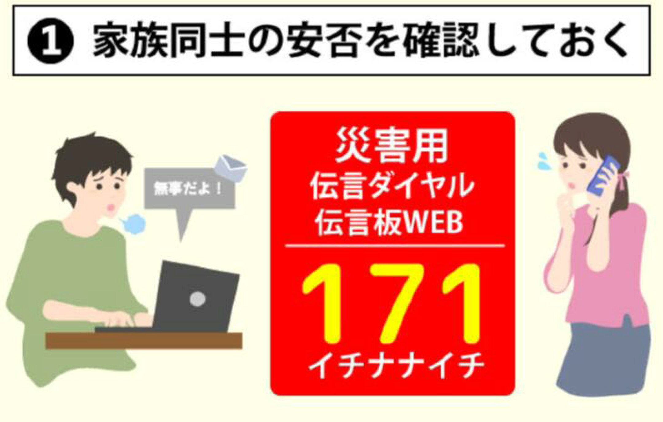 ❶家族同士の安否を確認しておく 災害時は、通話が集中して電話がつな がりにくくなります。 災害用伝言ダイヤル やSNSサービスをあらかじめ準備して活 用しましょう。 災害用ダイヤルは 『171』。 ❷自分の住んでいる地域の避難場所・避難経路を確認しておく 各市区町村が作成する 『防災情報マップ』 で、お住まい地域の避難場所と避難経路 確認し、家族皆で共有しておきましょう。