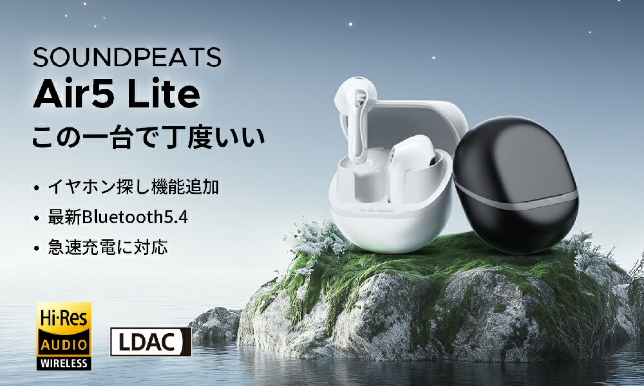 SOUNDPEATS Air5 Lite ワイヤレスイヤホン 完全ワイヤレスイヤホン 軽量 インナーイヤー型 通話ノイズリダクション Bluetooth5.4 LDAC対応 ハイレゾ音質 13mmドライバー マルチポイント 急速充電 最大30時間 イヤホン探し機能 高音質 通話 マイク付き 黒 白