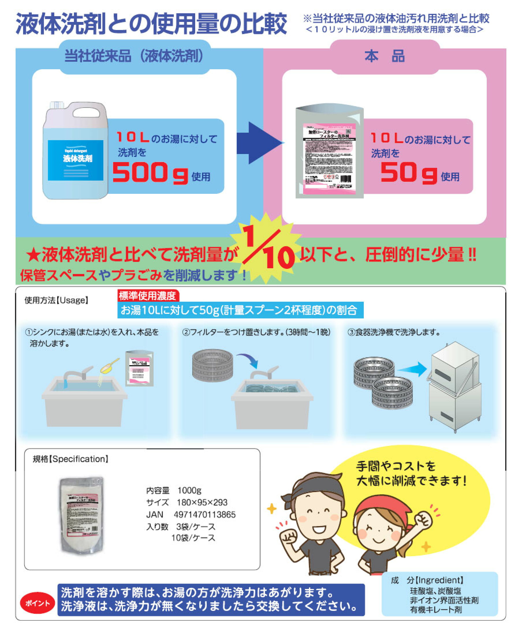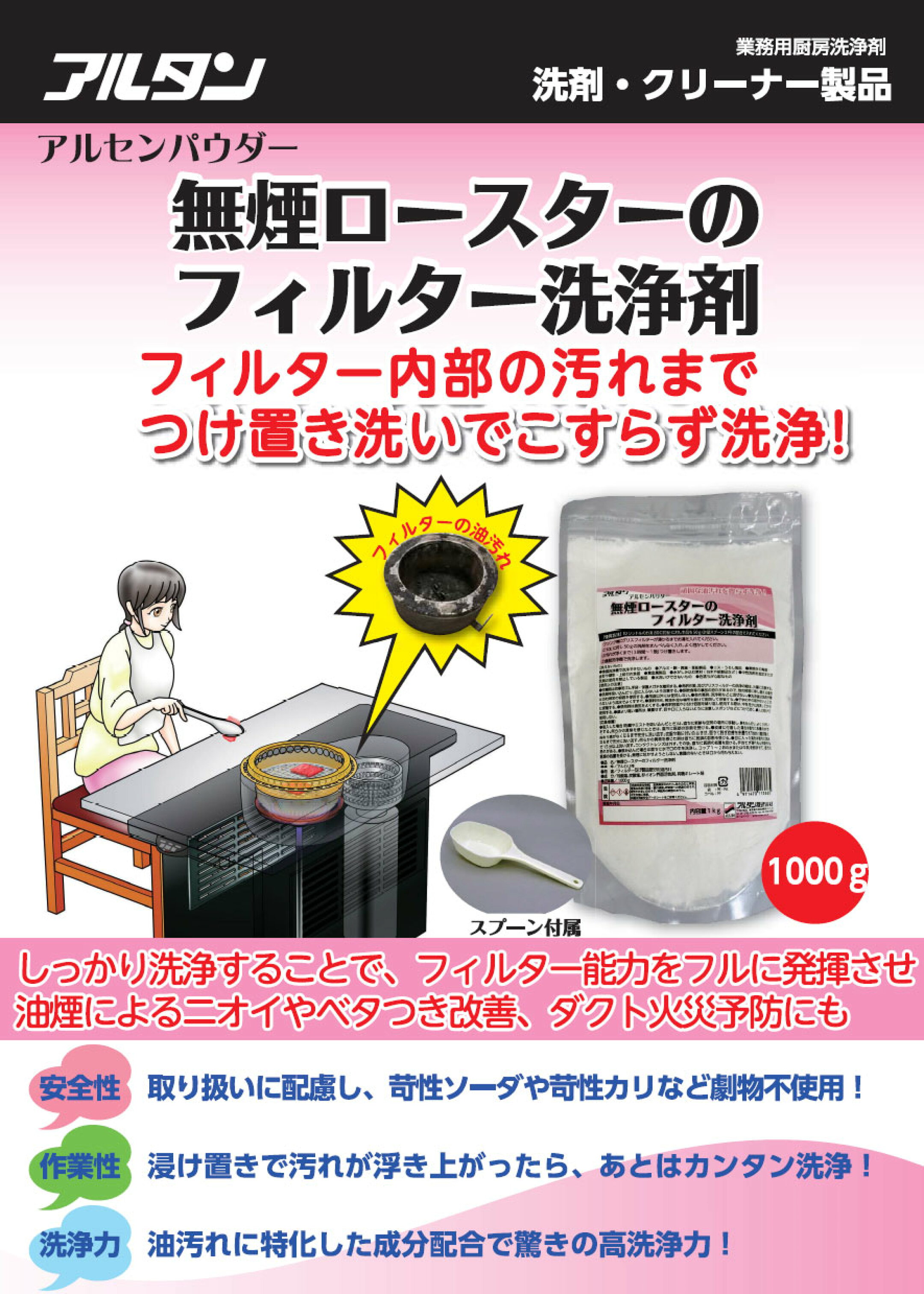 ●ロースターのフィルター用洗浄剤[アルカリ性 ][粉末 ] 頑固なこびりつき汚れをつけ置きで擦らず洗浄できます。