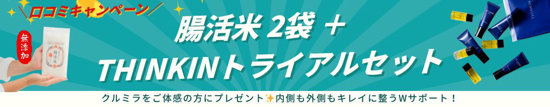 ★thinkinトライアルセット★ 話題のスキンケアシリーズをお試しいただけます。 ★腸活米★ 毎日の食生活から体の内側をサポート。美容と健康に嬉しいお米です。