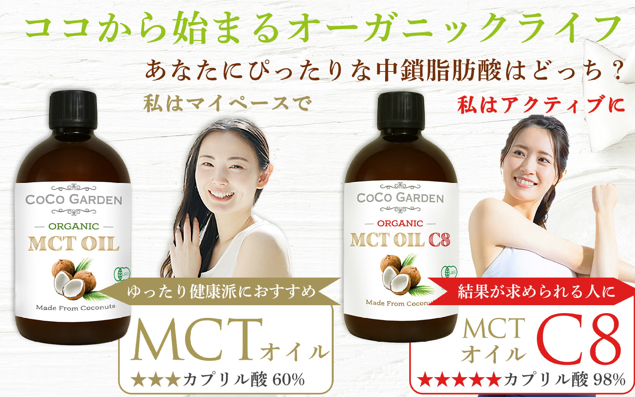 【新商品 】MCTオイル C8 500ml 2個セット 有機JAS認証 オーガニックココナッツオイル由来 ココガーデン 中鎖脂肪酸100% C8 カプリル酸 98% 無農薬 無添加 C8 に特化 (98%)したMCTオイル 炭水化物 の置換え ロカボ ダイエット にも 公式 送料無料