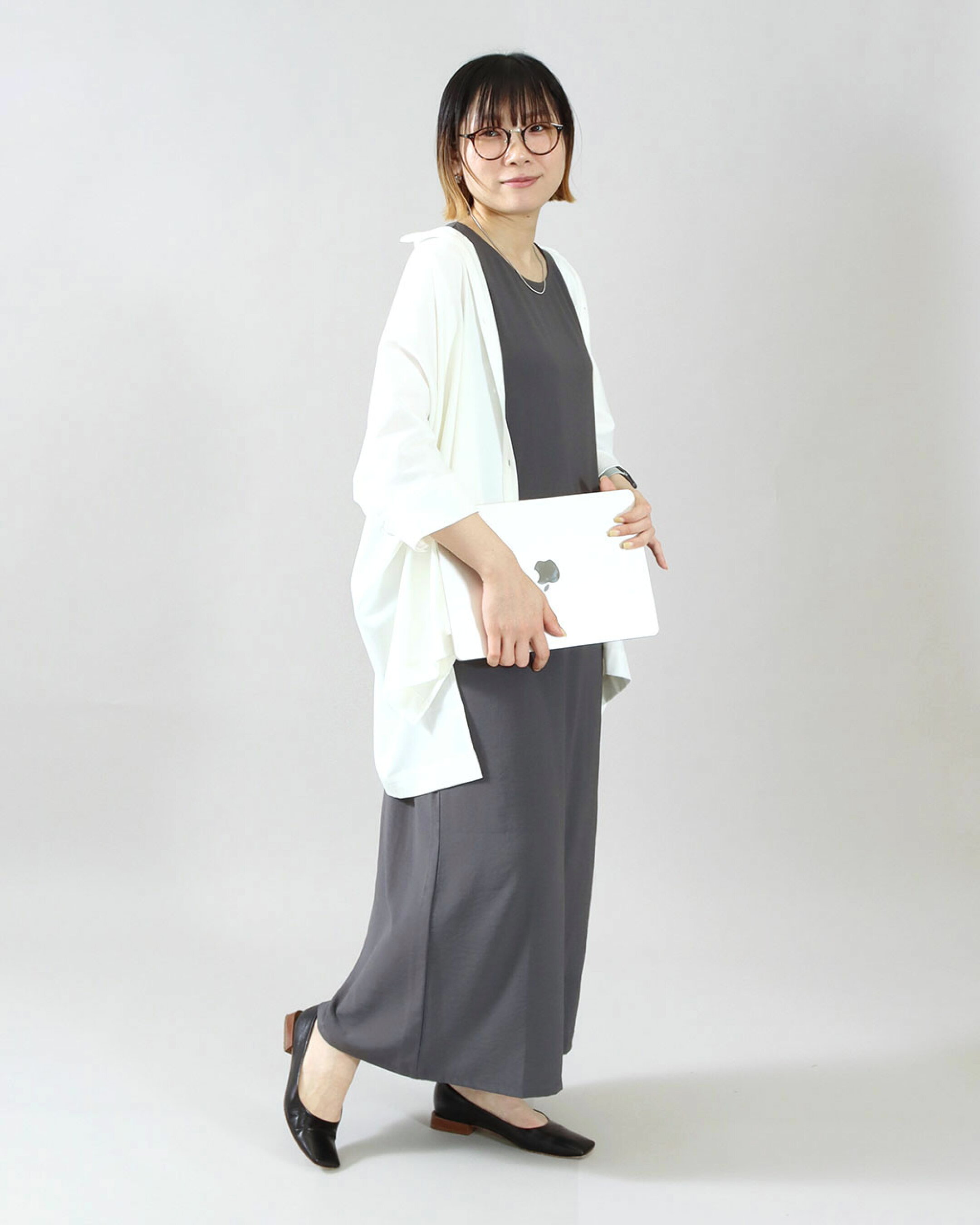 シンプルワンピが一気にオフィス仕様に! 冷房対策にもなる、きちんと見えのシャツ羽織はマスト◎サラッと羽織って、冷房もおしゃれも対策。