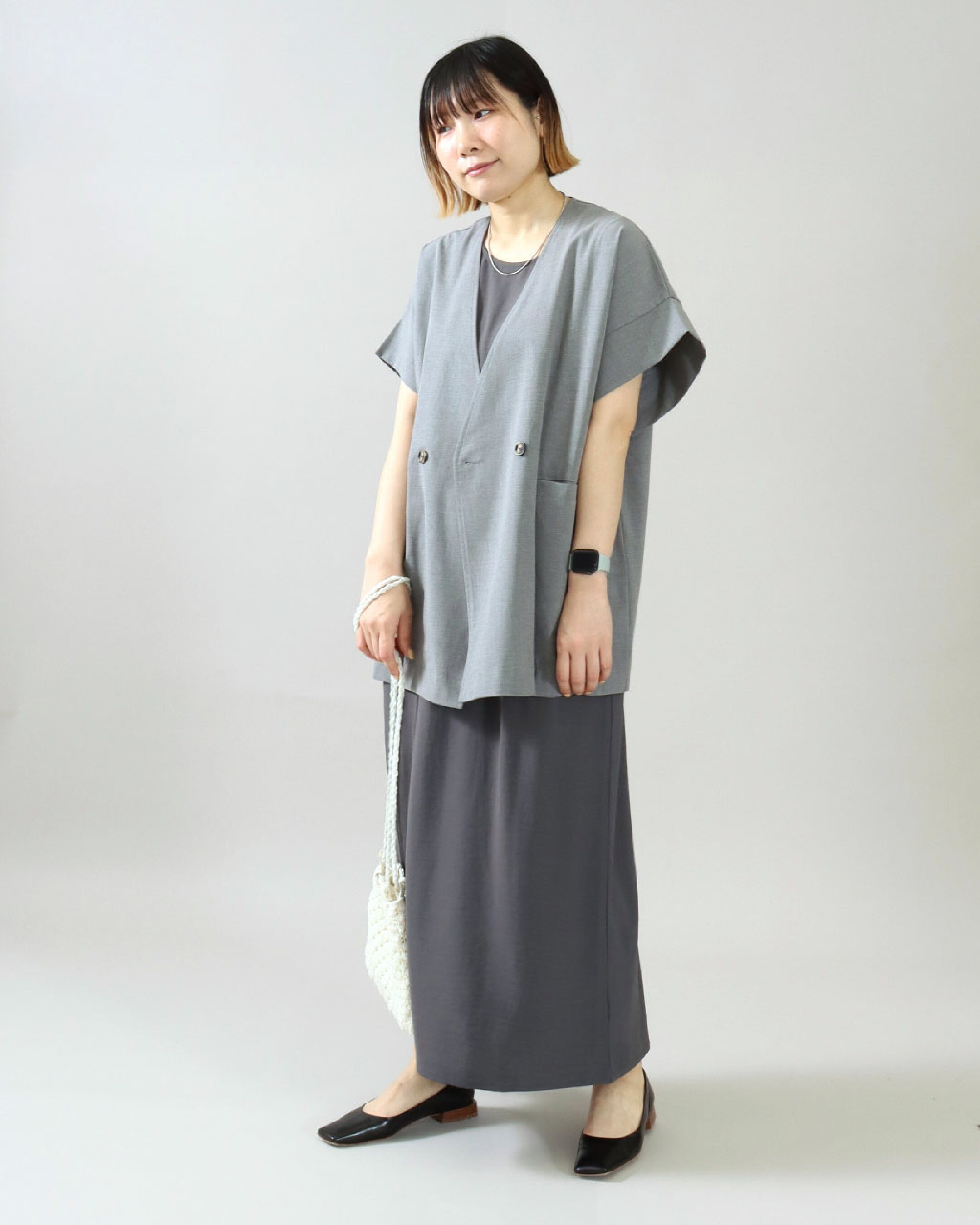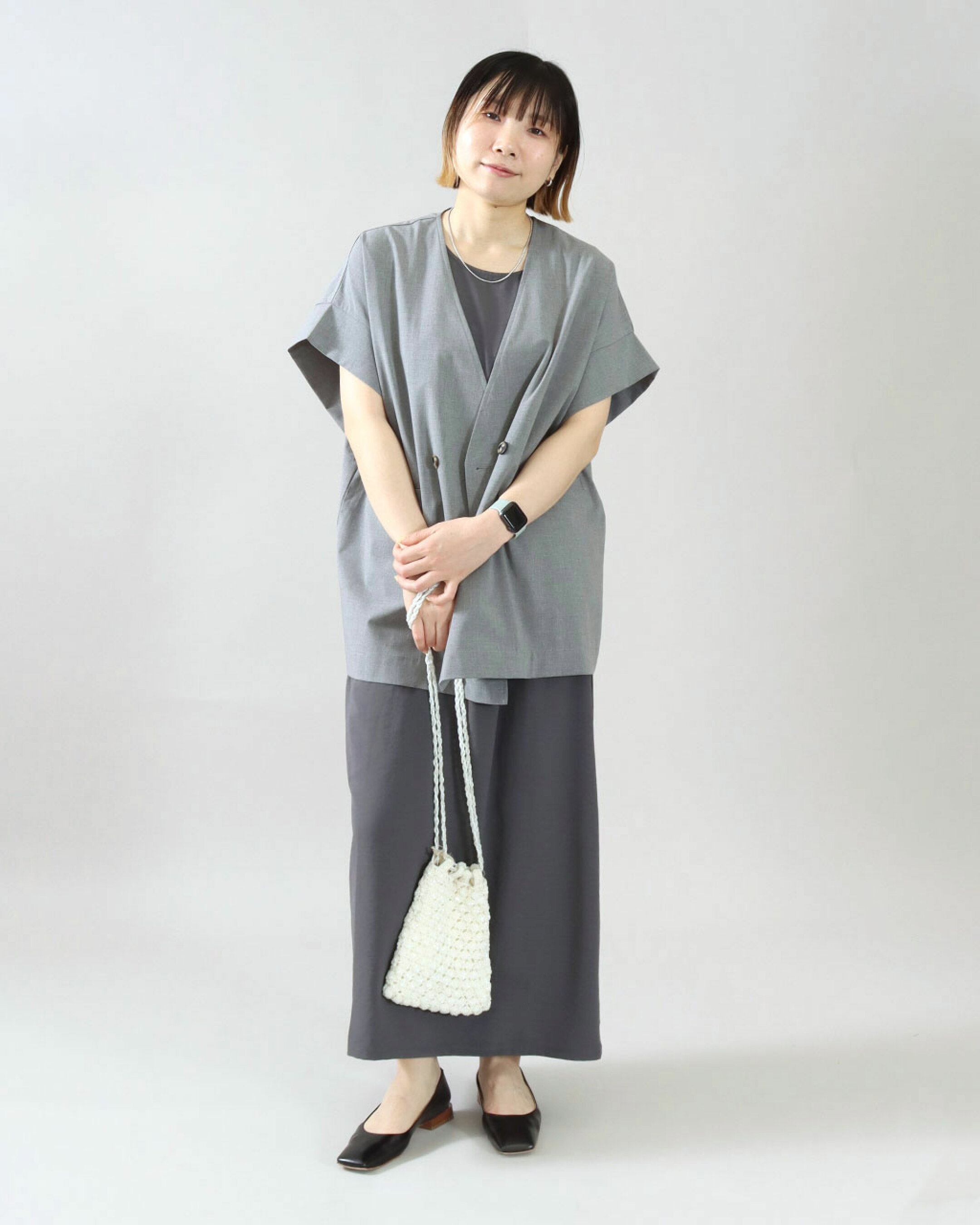 休日スタイルは、”楽ちん” と ”品よく" を両立させたコーデが正解。 メッシュベストをプラスして旬なスタイルに。レイヤードするだけで体型カバーが叶う、優秀レイヤードコーデです◎