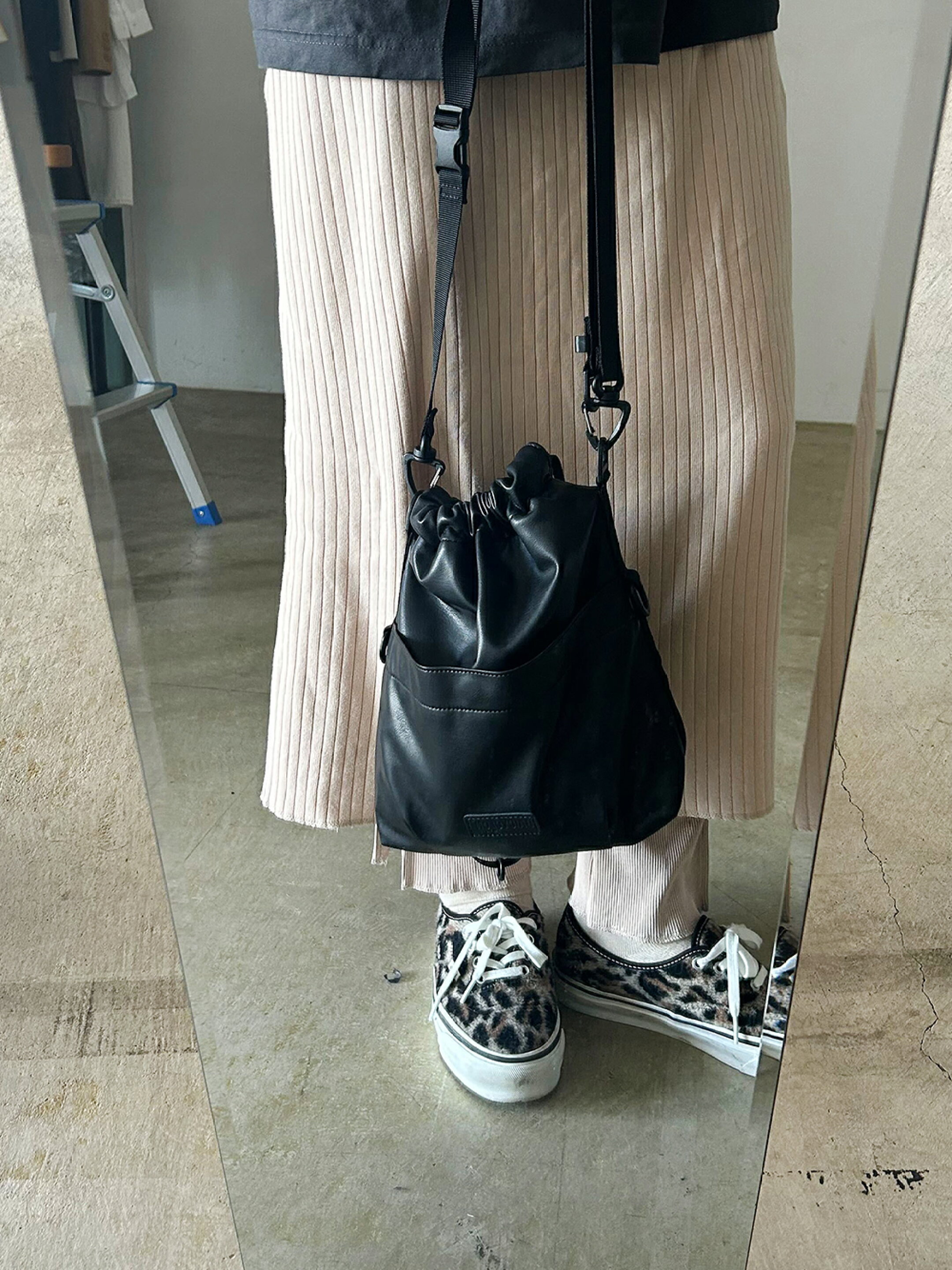 BAICYCLON by Bagjackのドローストリングバッグ。 フェイクレザーって、重たいイメージありませんか? 私もそう思っていたんですが、これはびっくりするほど軽い。 持った瞬間、「あれ?持った?」って思うくらい。笑 毎日のように持ってても全然ストレスにならないんです。 しかも、見た目はコンパクトなのに収納力もかなり優秀! 500mlのペットボトルも、ポーチも折りたたみ傘も、ちゃんと収まります。 そして、もうひとつ嬉しいのが、裏地が丈夫なナイロン生地なので汚れに強い! 表地は、フェイクレザーなので濡れてもさっと拭ける安心感。なのに上質な雰囲気も◎ 軽くて、たっぷり入って、天気も選ばない。 気づけば毎日これを手に取っている、そんな頼れるバッグです。