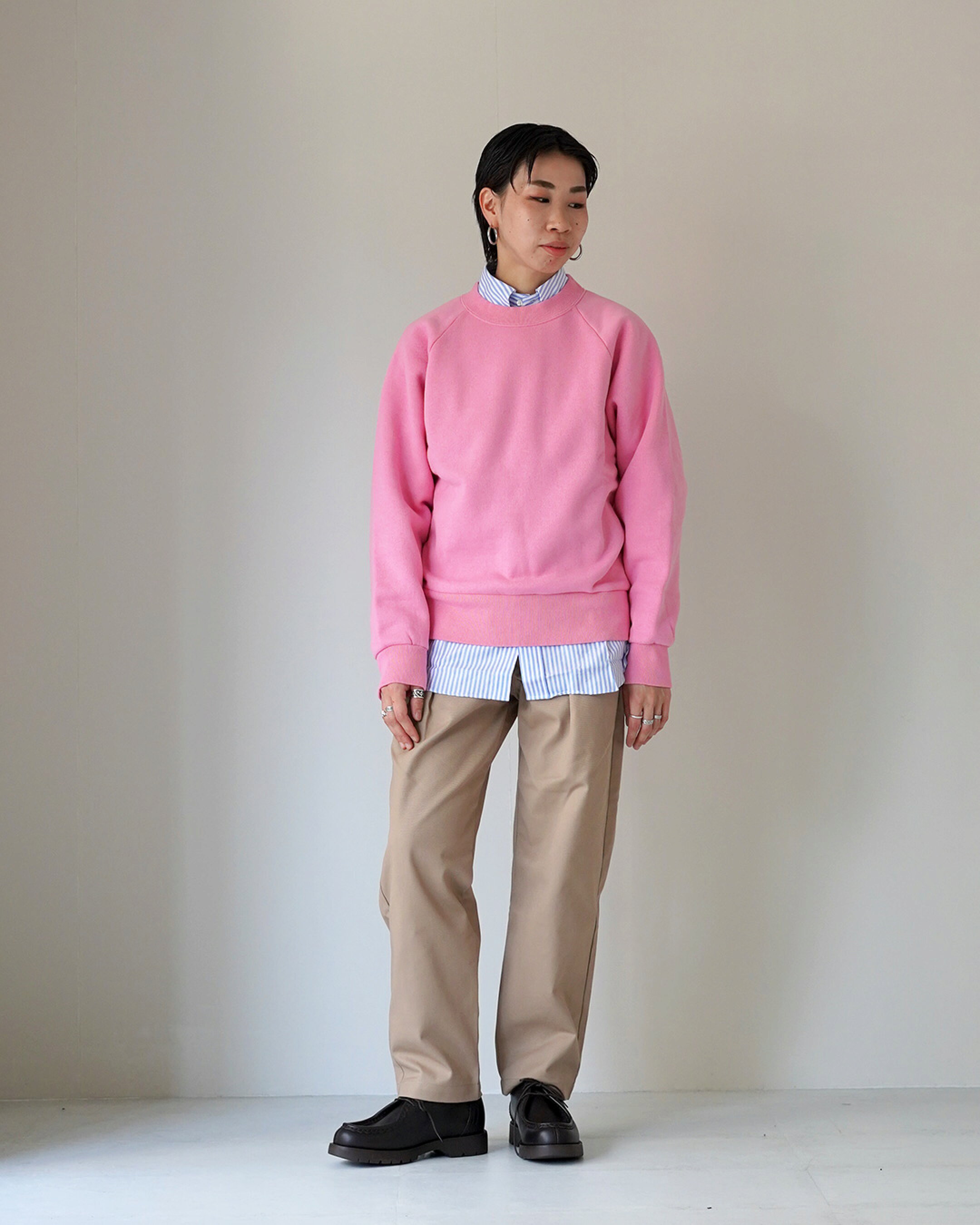 - 今回のメインアイテムは? SHINZONE定番のコモンスウェットのピンク。いつもは着ないカラーですが、春なので気分を変えて着用しました。 - こだわりのポイントは? 鮮やかなブルーとピンクの組み合わせがお気に入りです。 アメリカの休日のお父さんを意識しましたが、アクセサリーをじゃらじゃらつけることでトレンド感のある雰囲気に仕上げました。 By Hana (161cm) ◆着用サイズ SHIRT:S TOPS:F PANTS:28 SHOSE:39