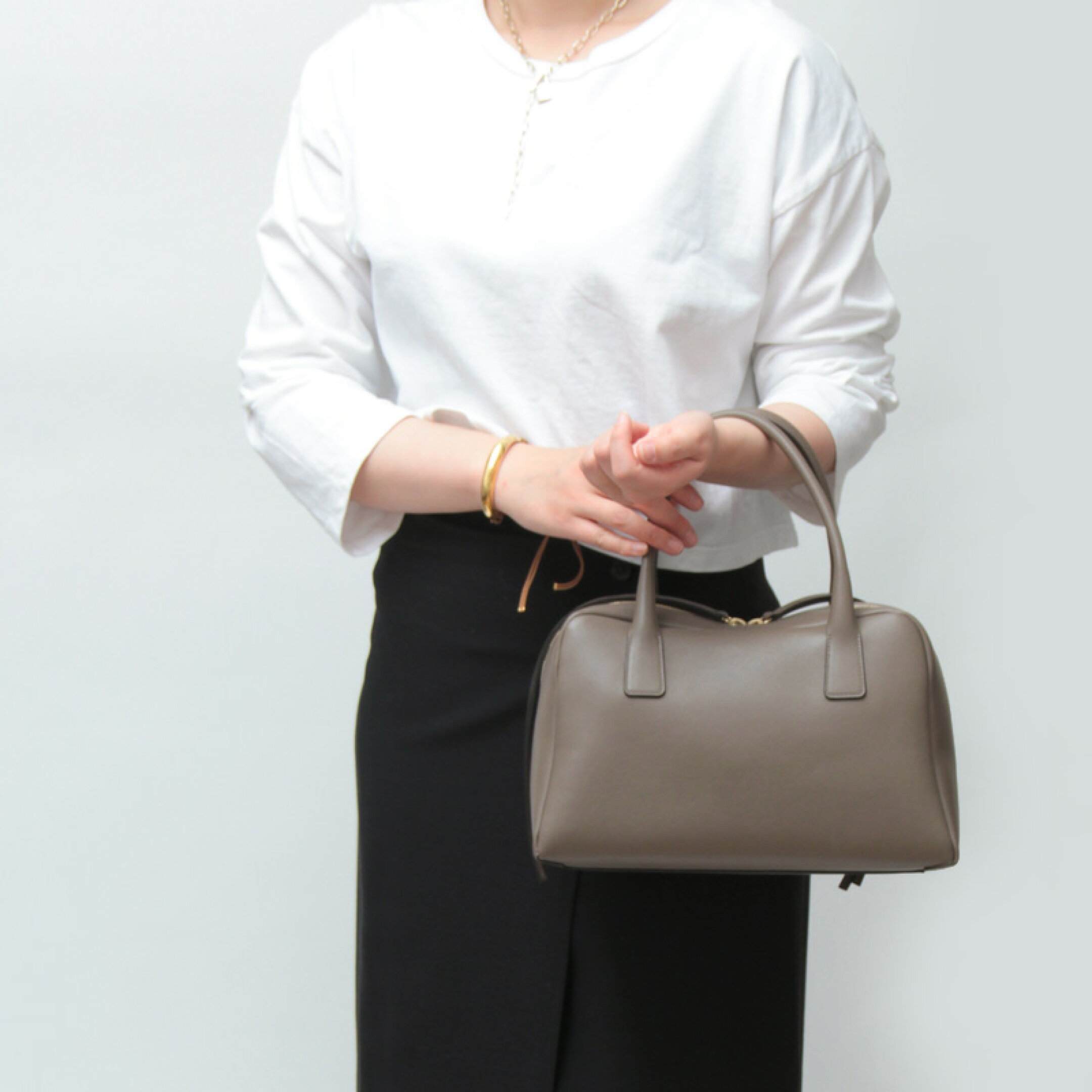 シンプルでミニマルなデザインが魅力の "Bowling Bag"。長めのフリンジ引手がアクセントとなり、モードな雰囲気を演出する横長ボストンです。実用性のある収納力を備えながら、ほどよい抜け感でスタイリングをモダンに格上げ。毎日に寄り添う、上質で洗練された逸品です。