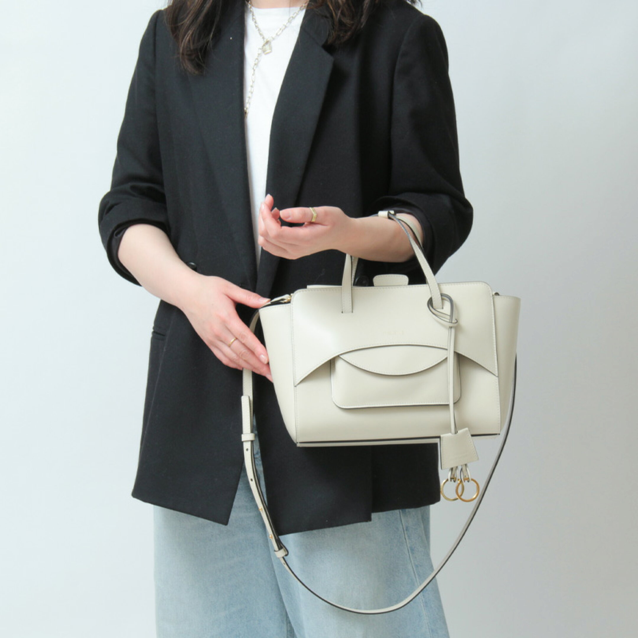 デザイン性の高いアイテムの中でも、"FLAP"は、フラップの下に隠れたポーチが美しく溶け込んだ、ユニークで洗練された一品。長めにあしらわれたキーリングが、さりげないアクセントに。オンにもオフにも馴染むエレガントな佇まいが、装いに品格を添えてくれます。