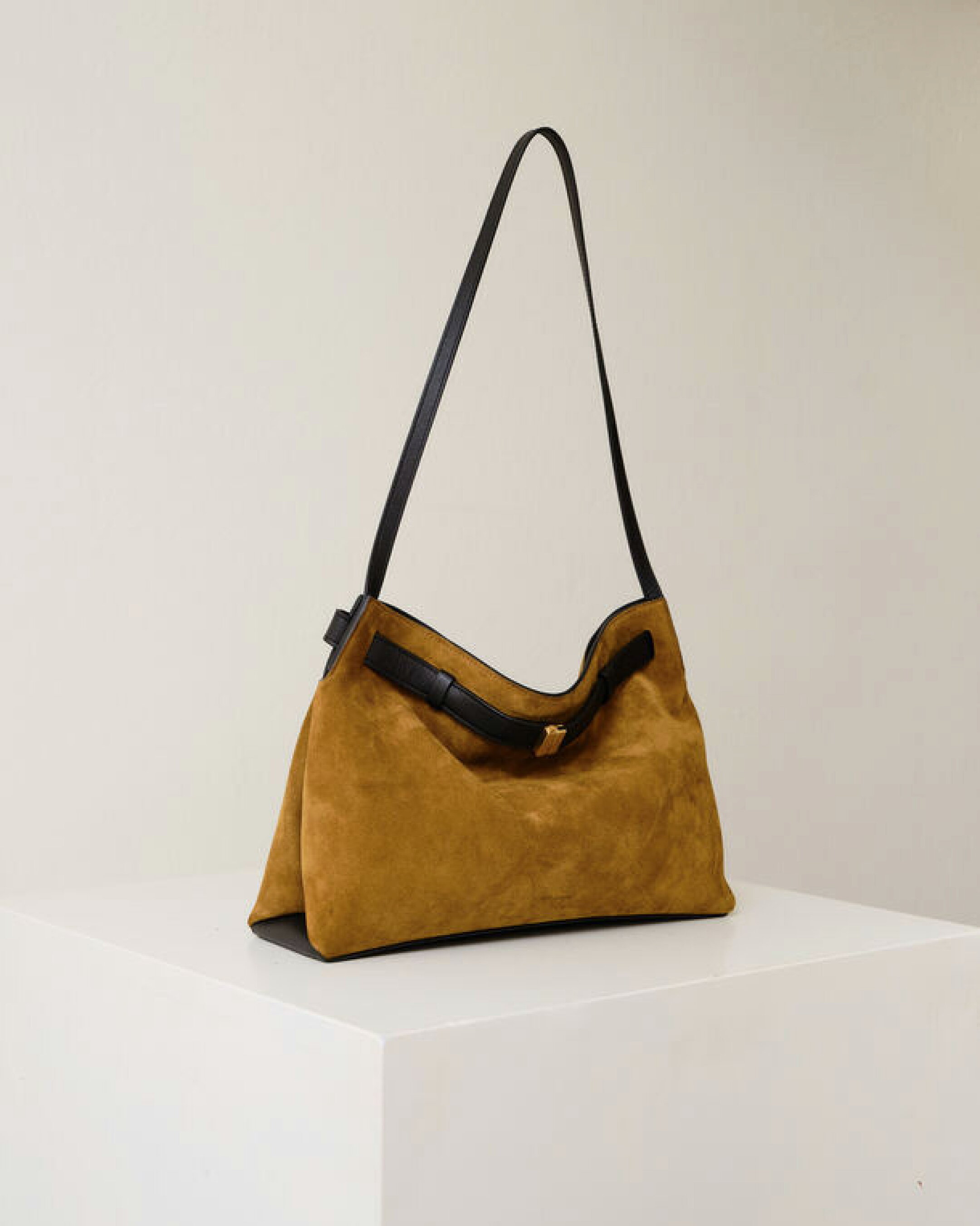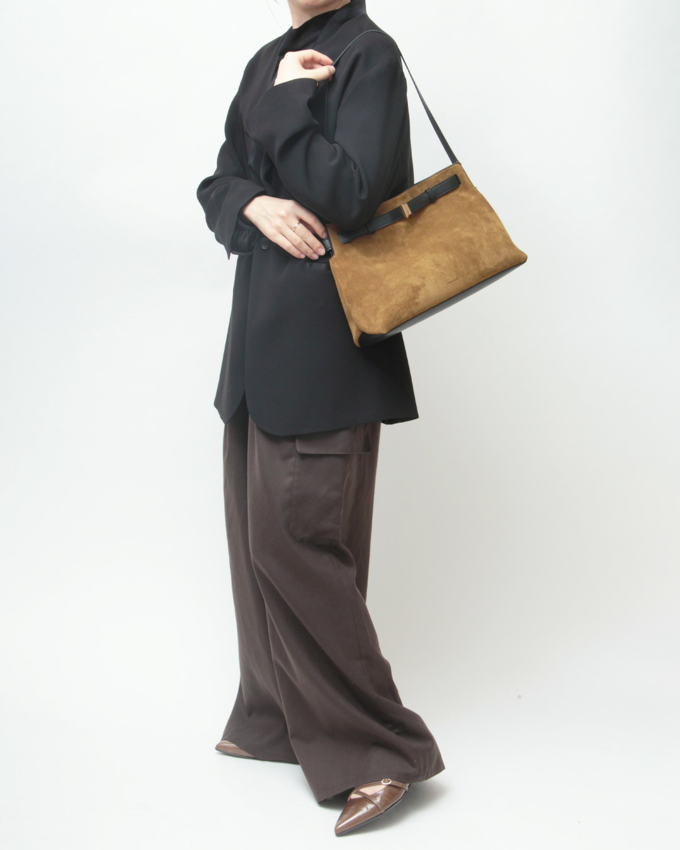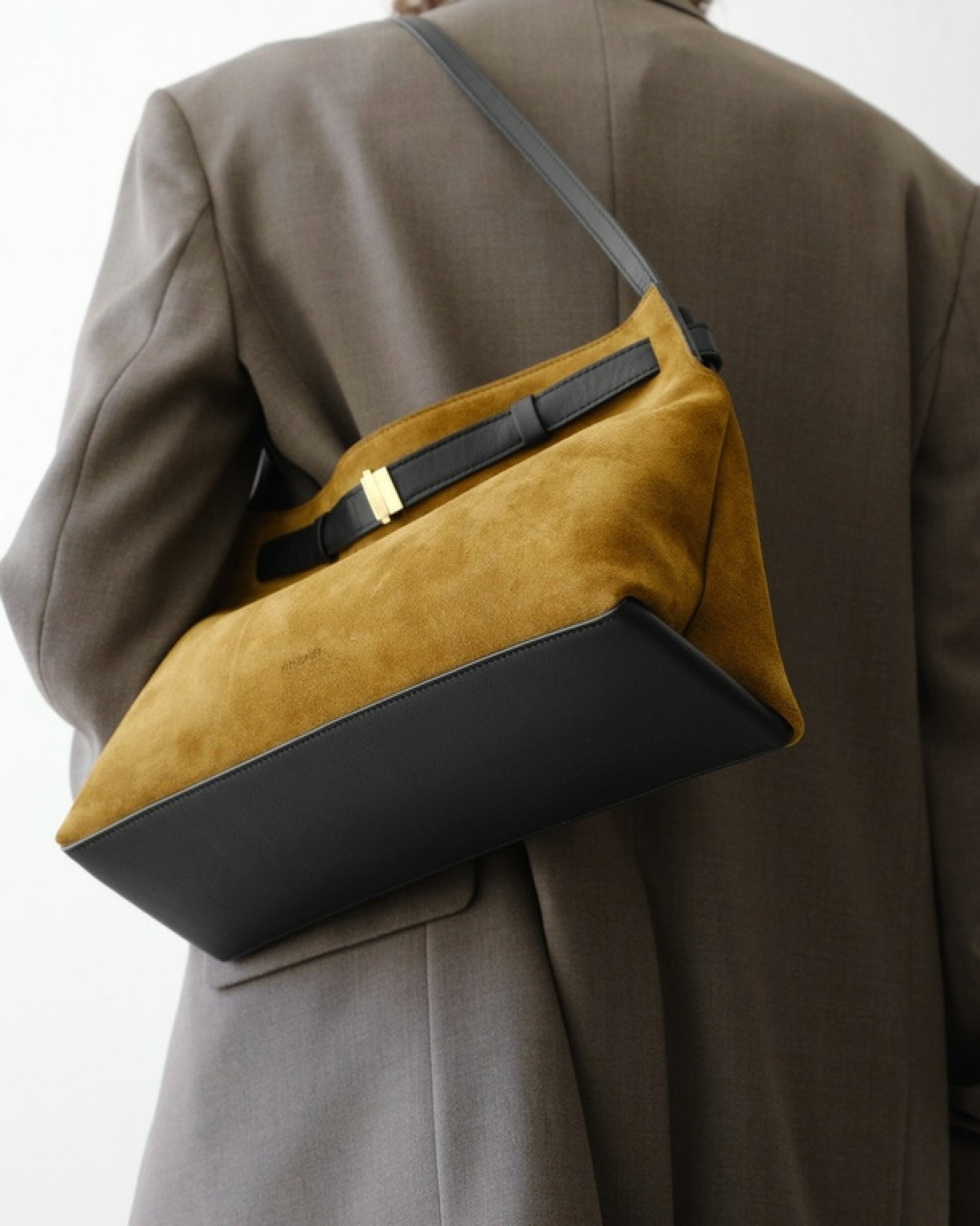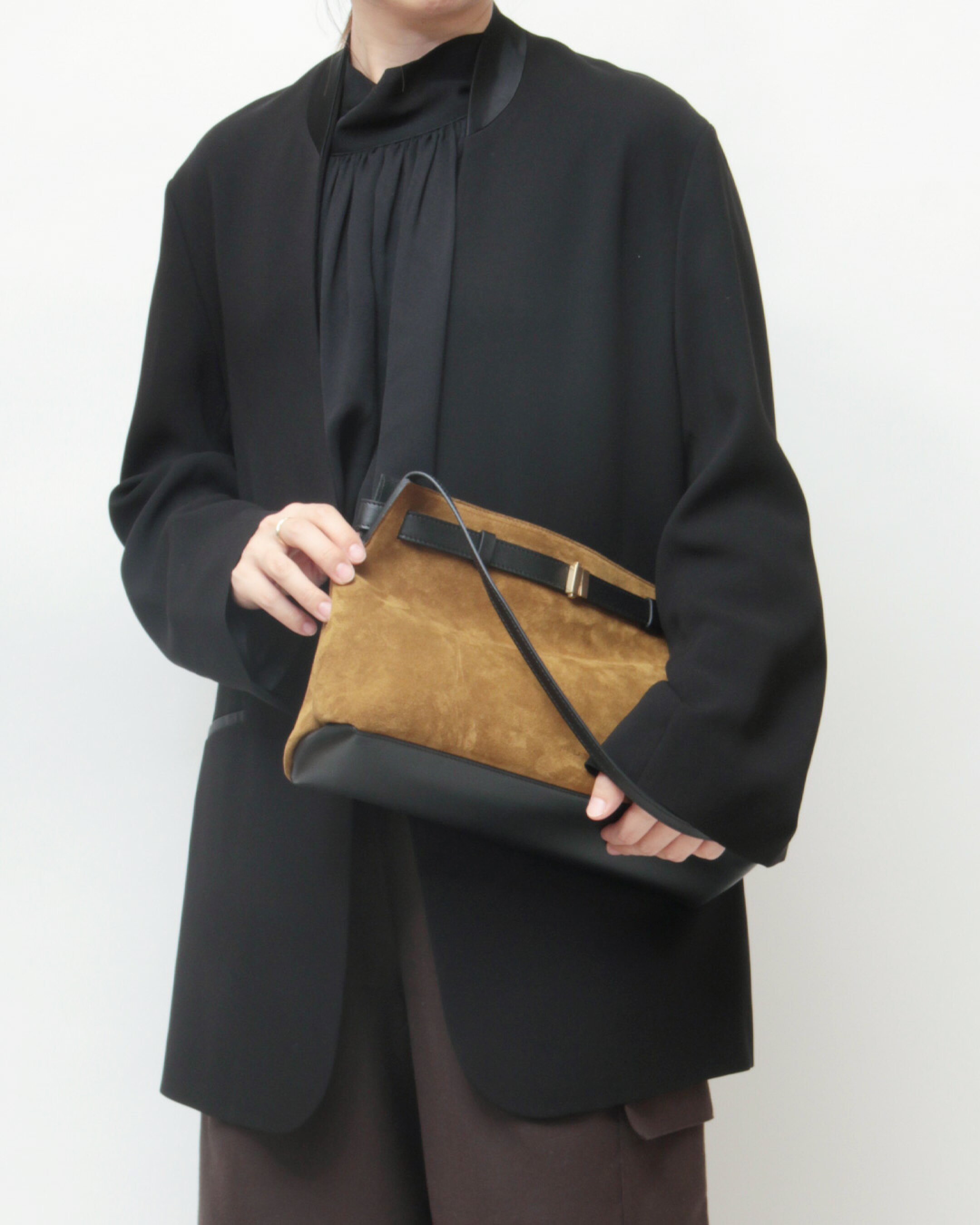 フロントのベルトデザインがアクセントになった、洗練されたワンショルダーバッグ。 マスタードのスエードとブラックのスムースレザーのコンビネーションが、装いに奥行きと上品さを添えます。