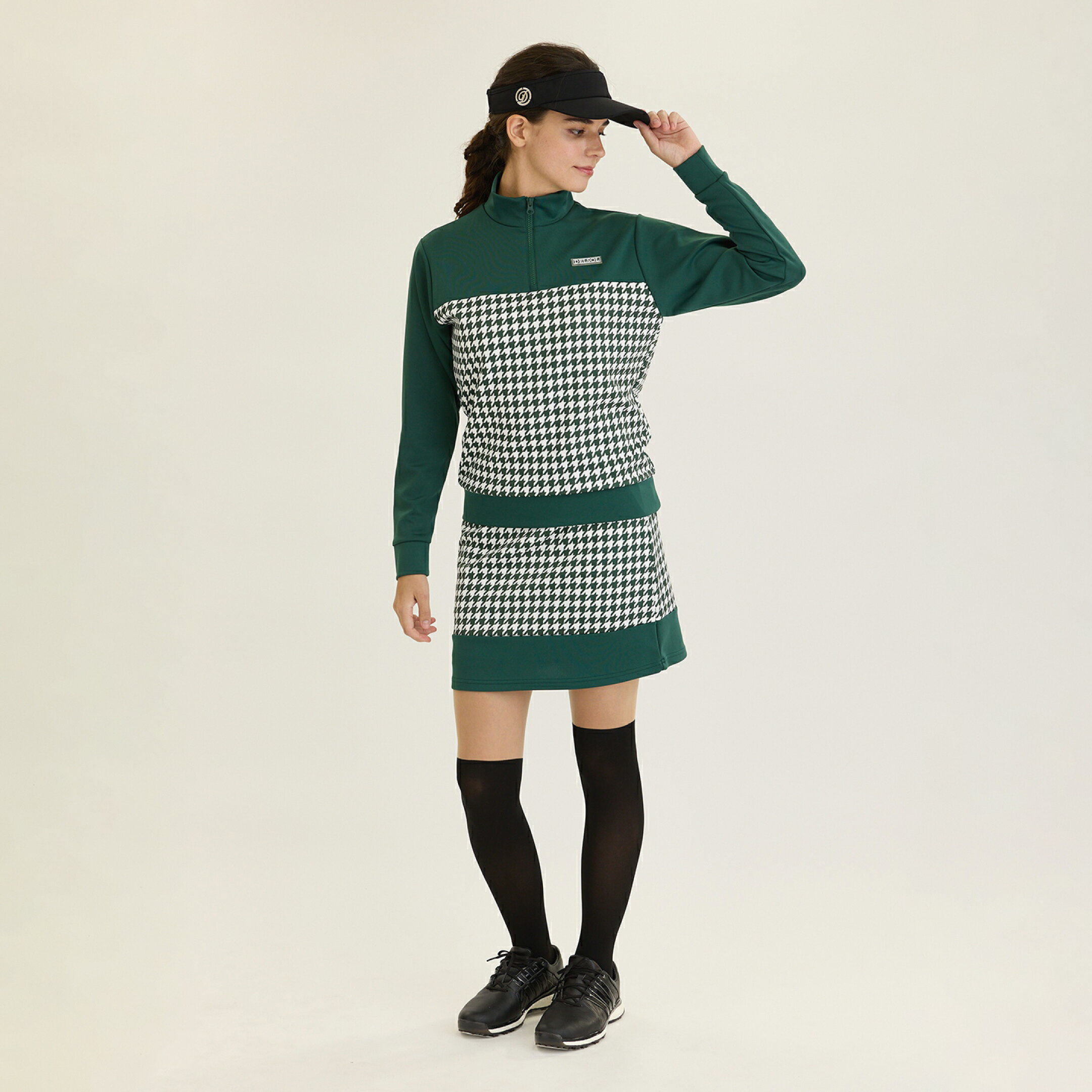 ゴルフウェア レディース デルソル セットアップ 大きいサイズ 7907 千鳥格子柄 ポンチ 長袖セットアップ 冬 秋冬 ストレッチ ゴルフ M L LL 3L 4L トップス スカート ブラック グリーン 黒 緑 千鳥 セット ウエスト総ゴム 上下セット ポケット ゴルフ 長袖トップス