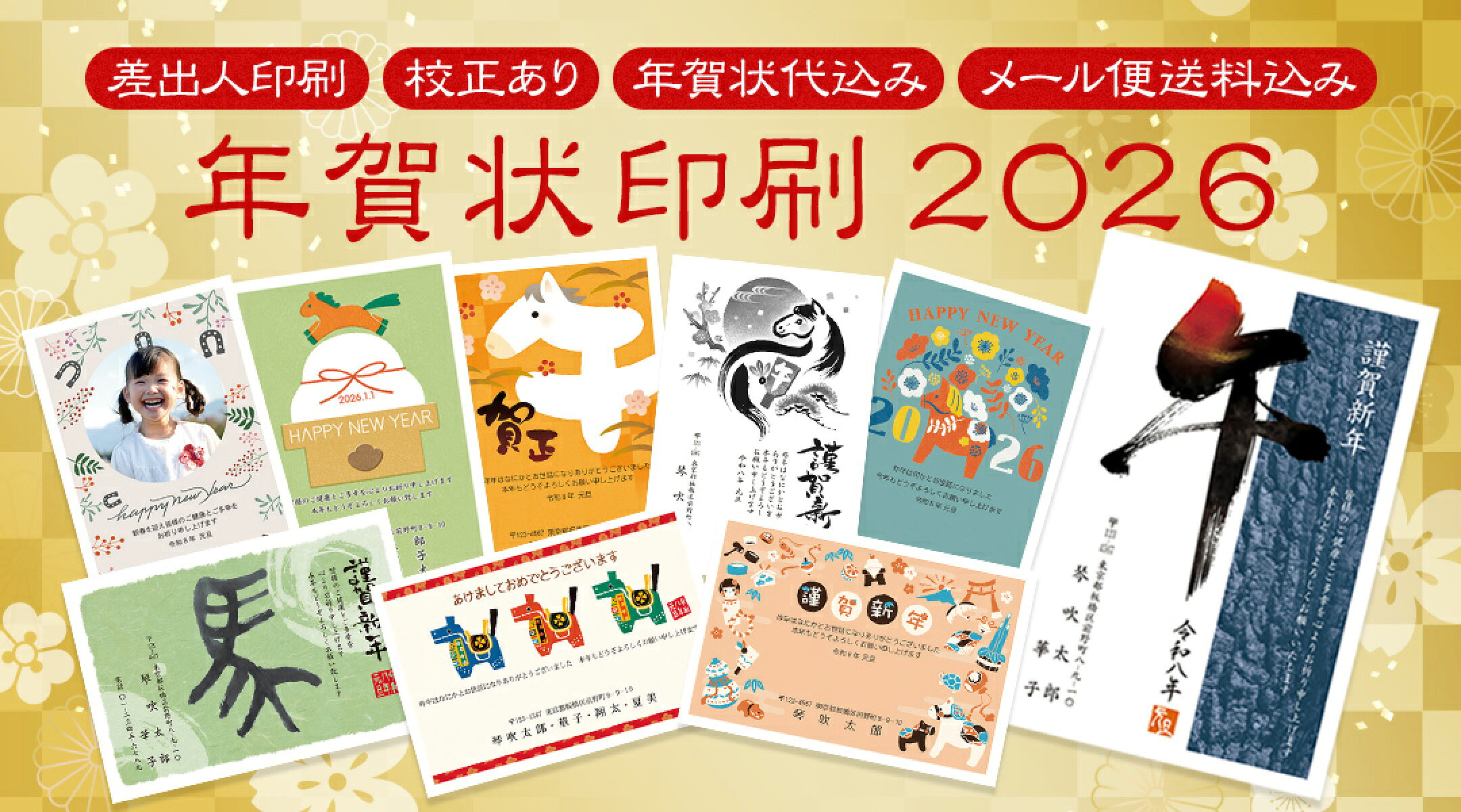 【24枚】【校正あり】年賀状印刷 2026 午年 イラストデザイン カラー[差出人印刷][添え書き文章・書体の変更可能][メール便送料無料]お年玉付き 年賀状 年賀はがき 年賀ハガキ 印刷 プリント 名入れ 午年 うま年 ウマ年 2026年 令和8年