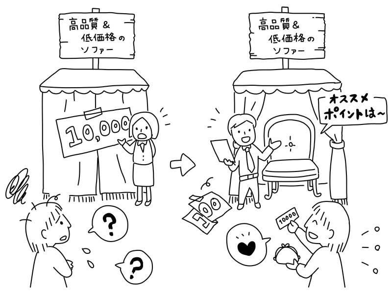 たとえば、他社では売られていない商品を扱ったり、他社よりもオトクに商品を販売したり、そのほか、アフターケアなどのサービスを充実させれば、選ばれる理由につながります。
