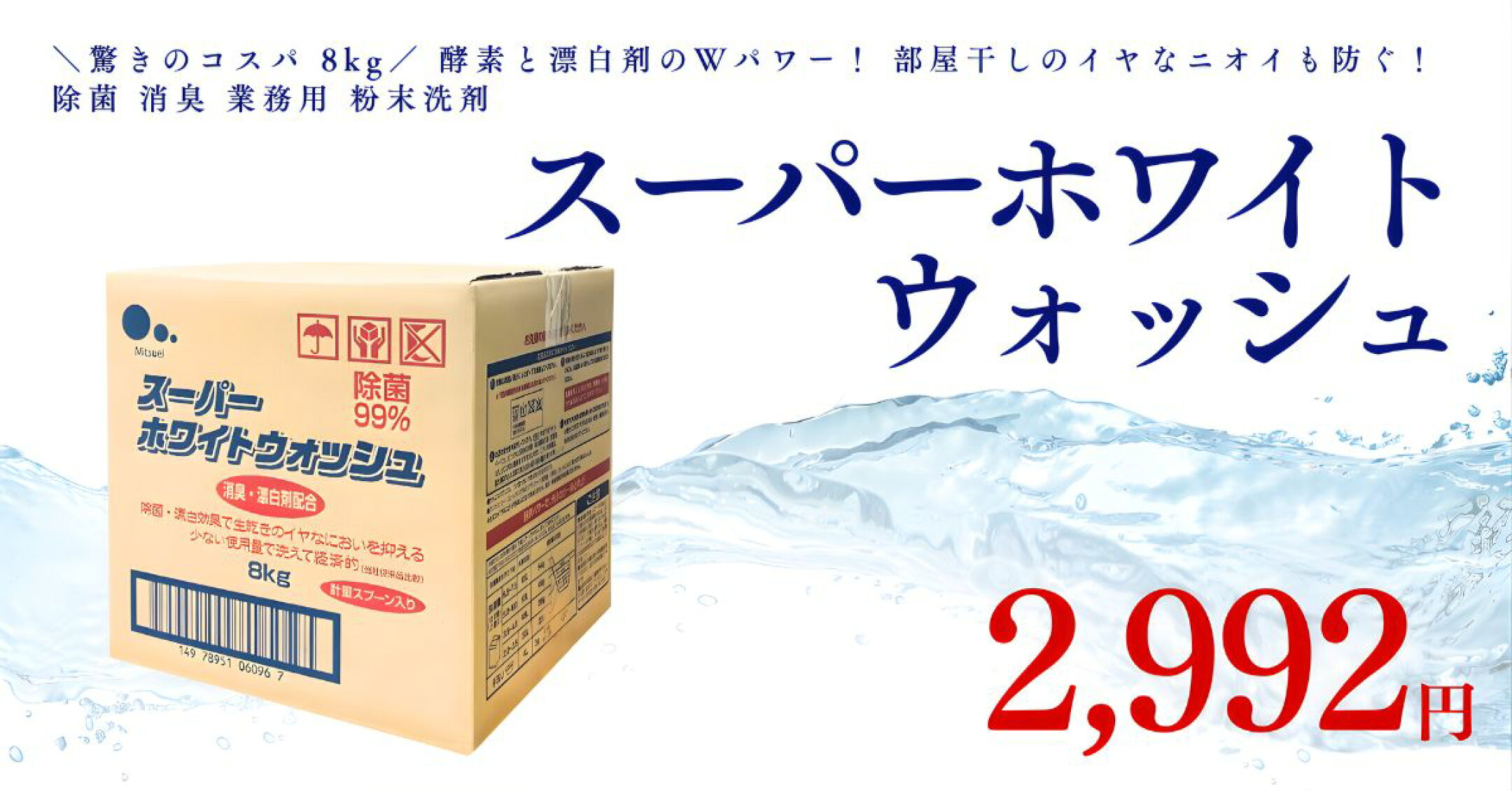 【業務用 大容量 8kg】 ミツエイ スーパーホワイトウォッシュ 8kg 粉末洗剤 衣料用洗剤 酵素配合 漂白剤配合 除菌 消臭 部屋干し