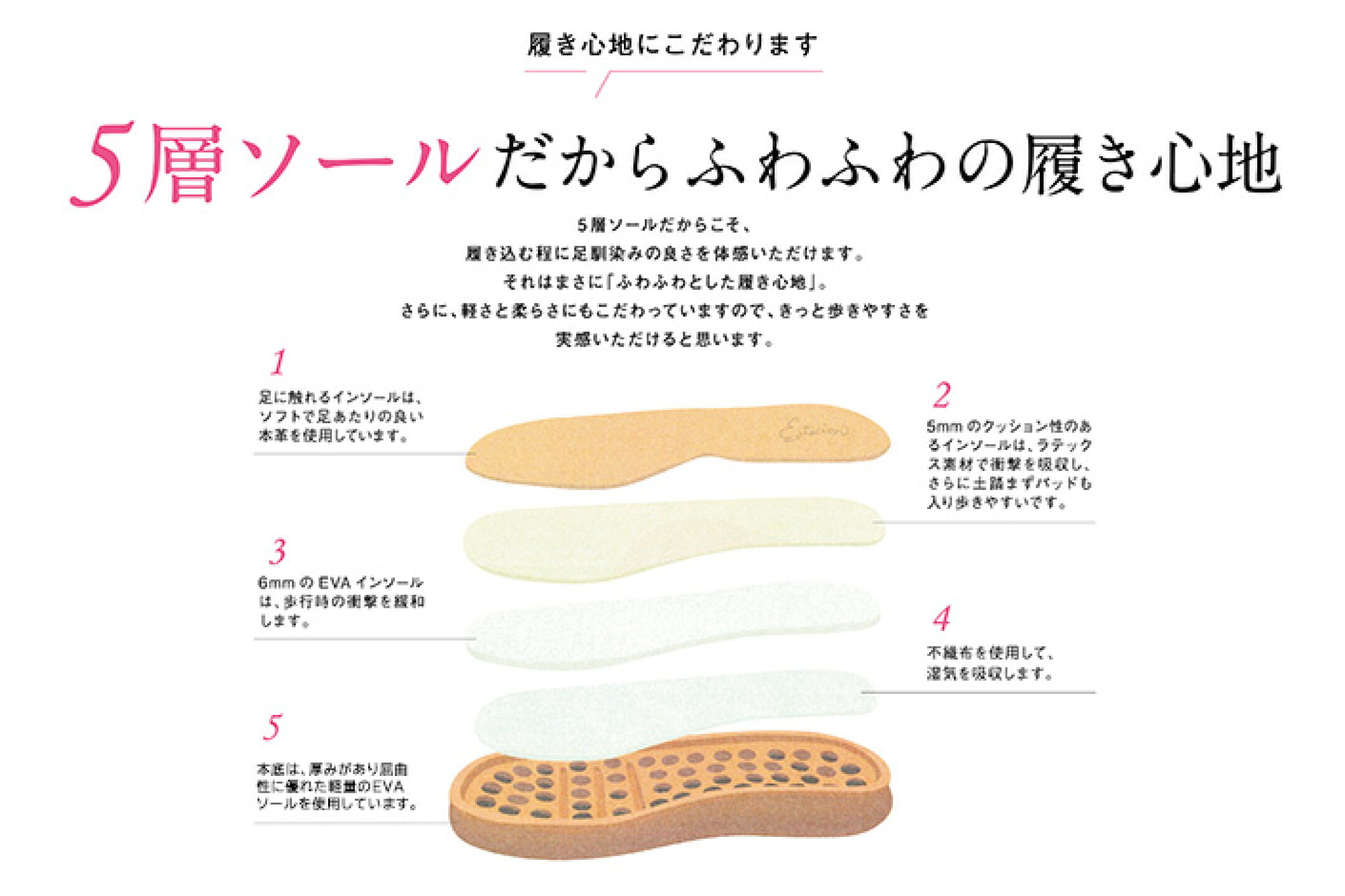 エスタシオンの靴を去年から履き始めました。 可愛いだけでなく、履き心地がとても良いです。 扁平足で疲れやすい足ですが、エスタシオンの靴で疲れた事はありません。 少々お高いですが、履いてみると納得できるお値段だと思います。