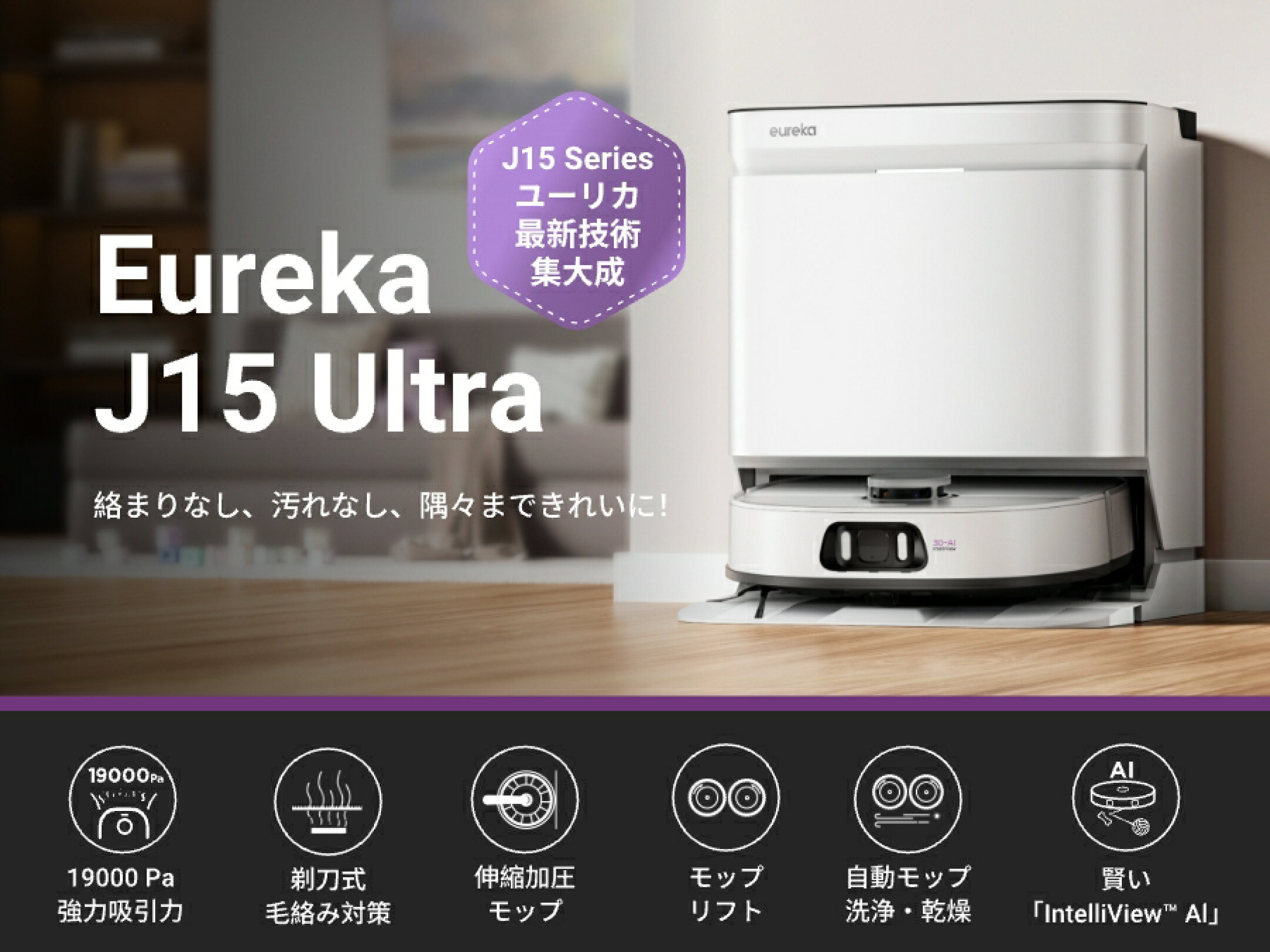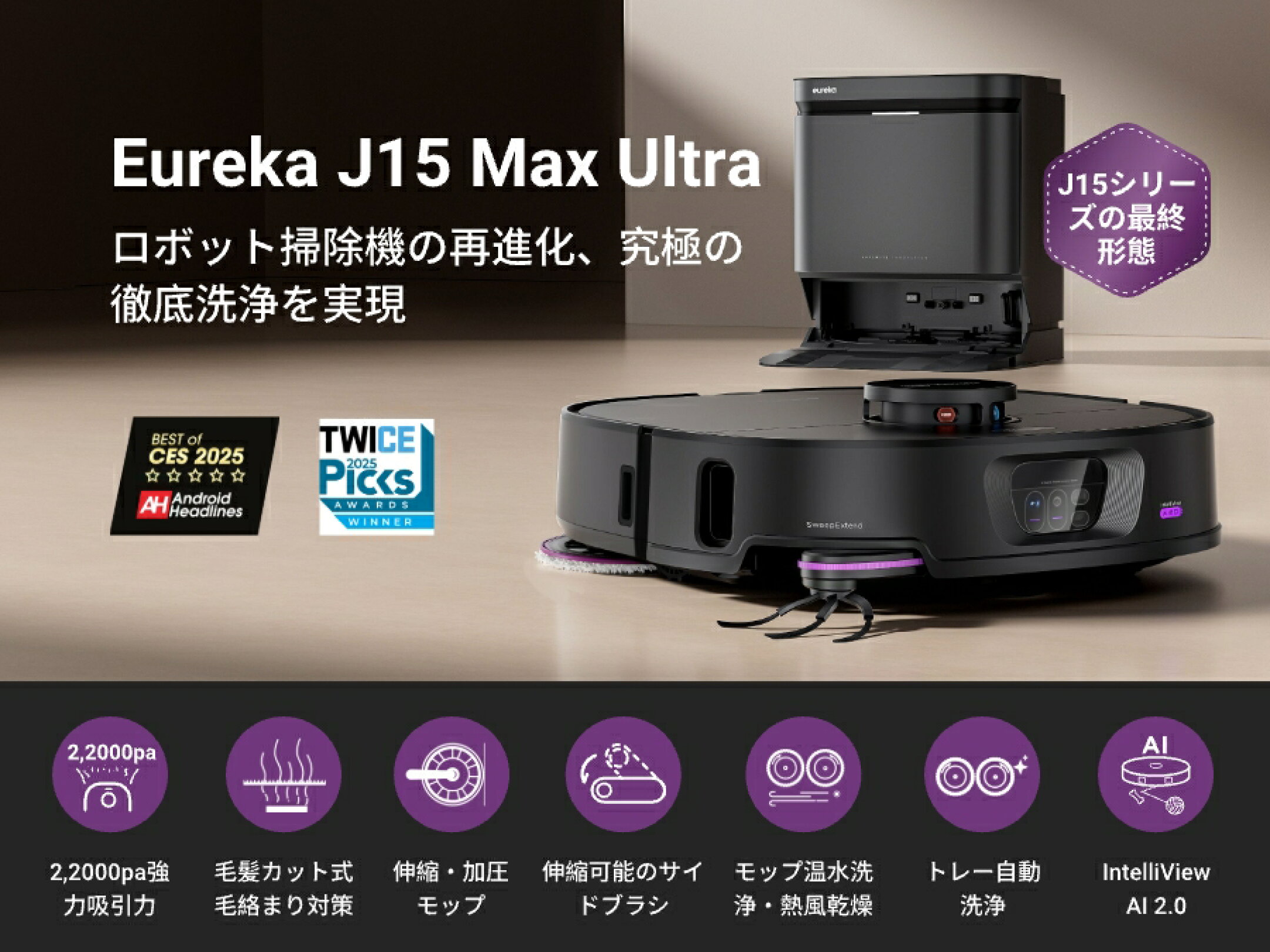 【クーポン利用で149,800円!11/11まで】2025最新 EUREKA(ユーリカ) J15 MAX ULTRA ロボット掃除機 22000Pa強力吸引 自動掃除ステーション エッジ掃除 絡み防止 拡張式モップとサイドブラシ モップ昇降 自動洗浄と乾燥 AI障害物回避 高精度マッピング