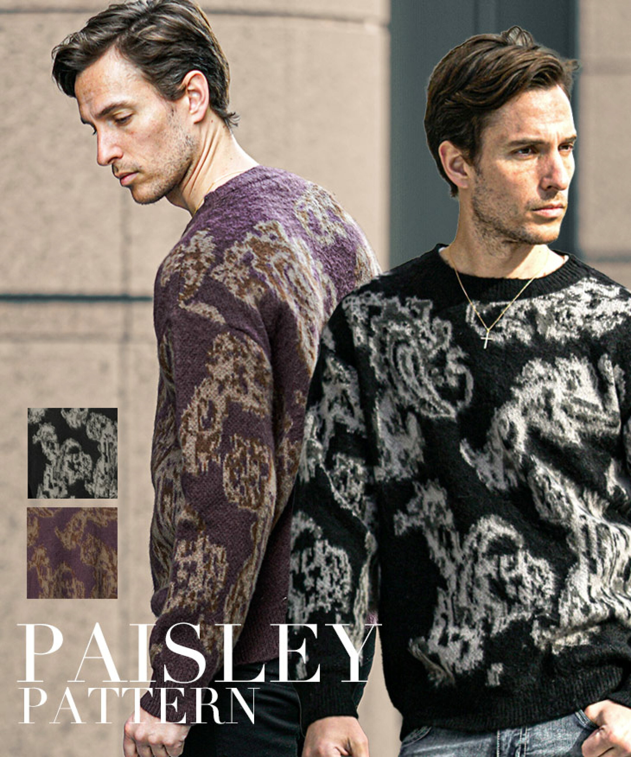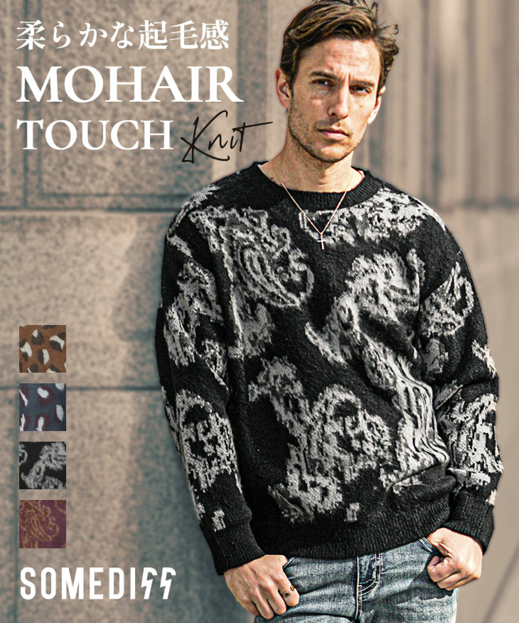 ニット メンズ 冬 オーバーサイズ ブランド モヘアタッチ セーター おしゃれ メンズ ビッグシルエット ニットセーター メンズ ヒョウ柄 ペイズリー柄 ブラック ボルドー ブラウン 肉厚 大きいサイズ XL 冬服 冬物 メンズファッション ちょいワル ジョーカー JOKER SOMEDIFF