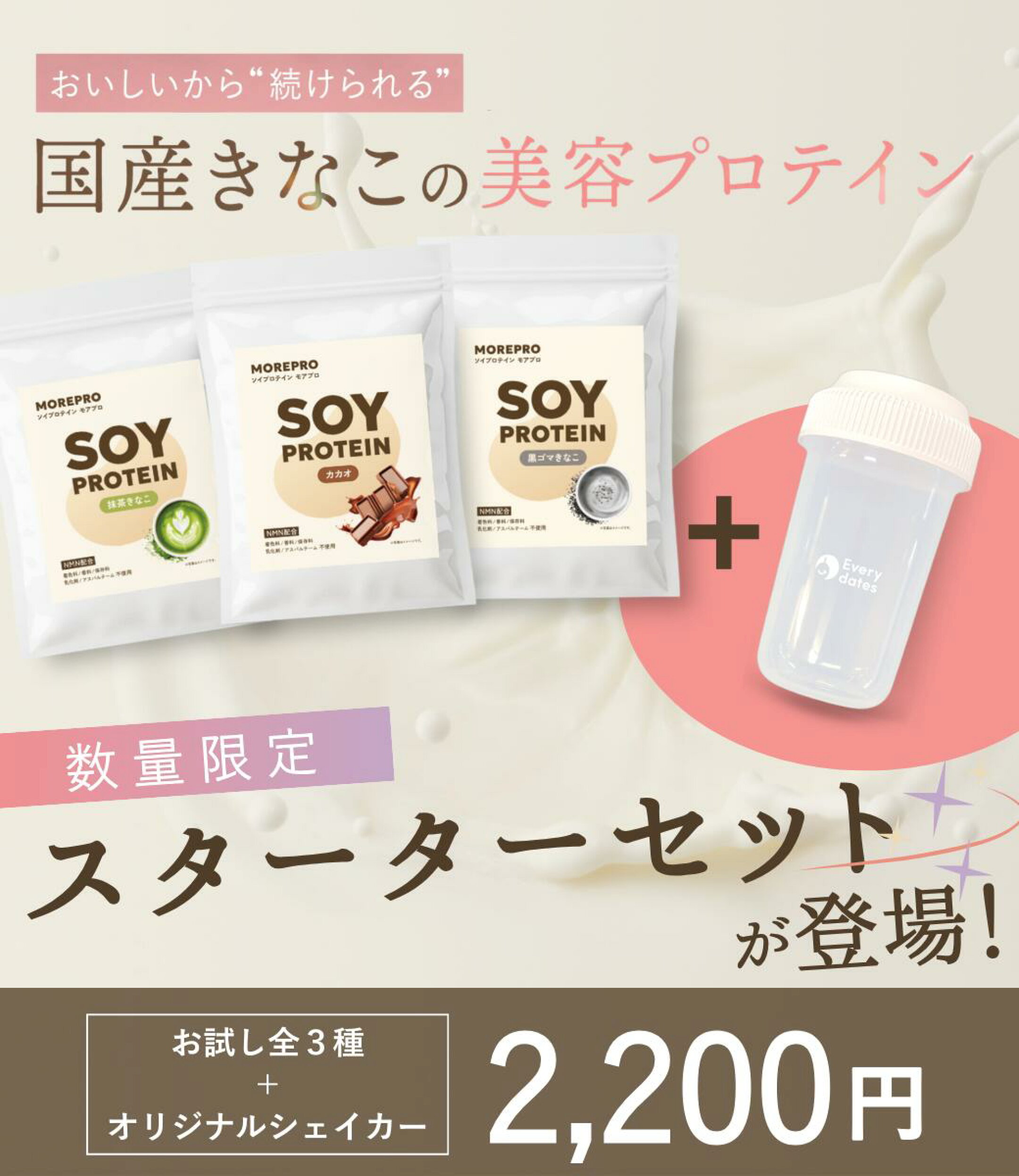 【300円クーポン】国産きなこの美容ソイプロテイン MOREPRO 60g/280g お試し サイズも《 シェイカーつき モアプロ 人工甘味料不使用 7つの添加物フリー 選べる3フレーバー 女性用 美容 ダイエット 置き換え NMN 乳酸菌 国産 きなこベース おいしい 》