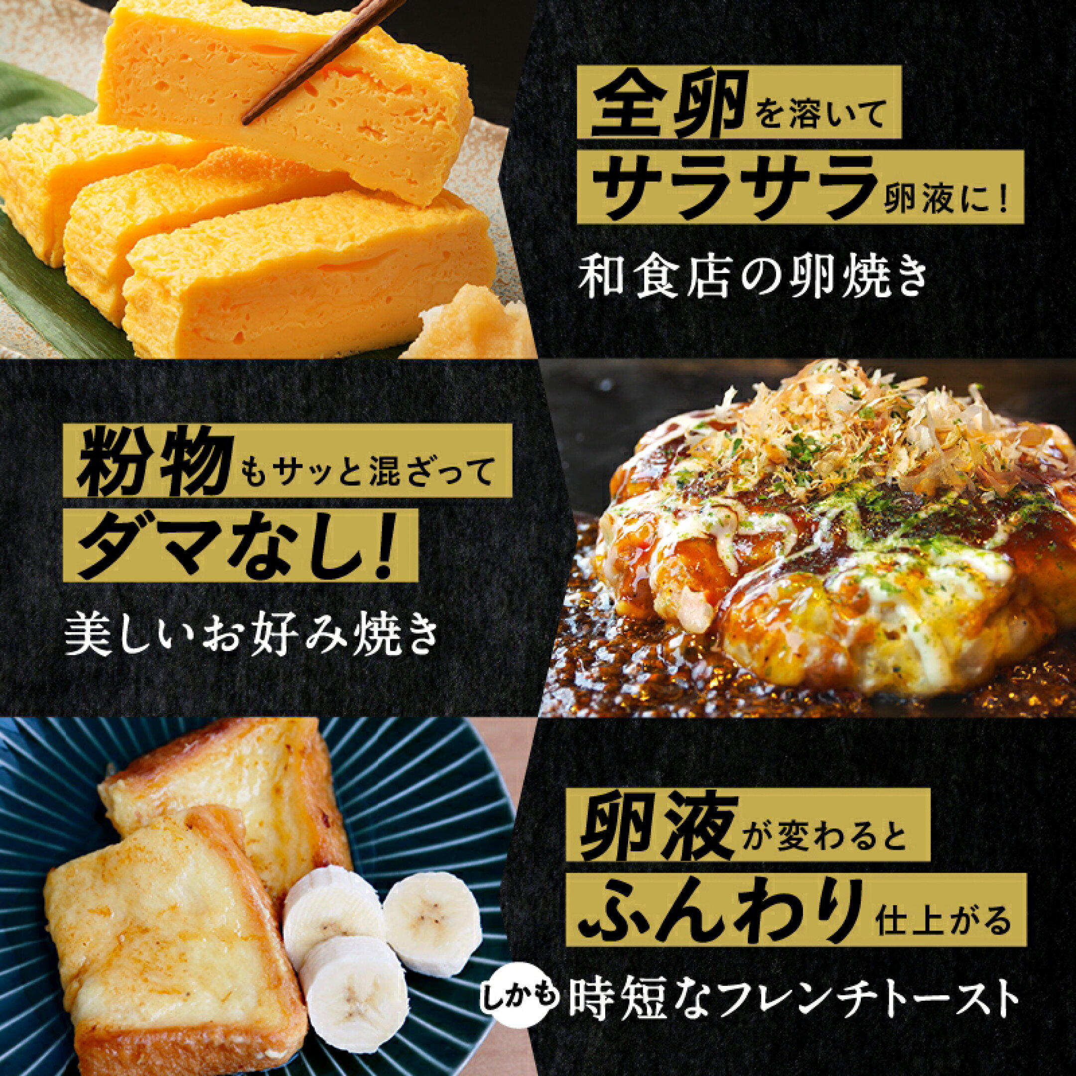 ときここちの使い方はとっても簡単です。左右に揺らすように20~30秒ほど混ぜるだけで、誰でも白身と黄身が完全に溶け合った、美しい黄金の卵液を作ることが出来ます。 卵液が変わるだけで、普段の料理が変わります! 卵だけでなく、混ざりにくい粉末や納豆を混ぜる時にもお使い頂けます!