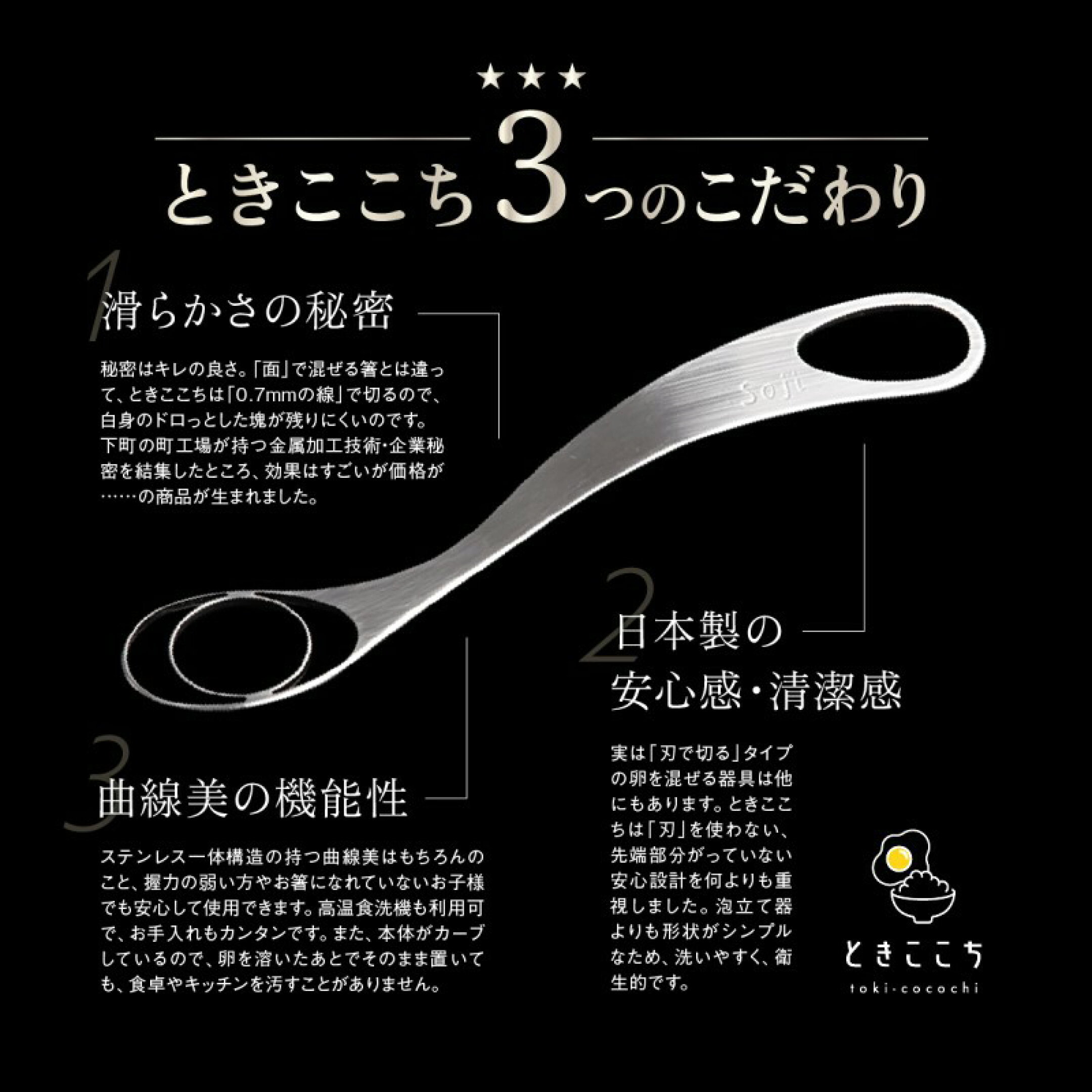 ときここちを使用することで、卵が究極の滑らか食感になります。その理由はステンレス製の特殊形状の先端部分が、箸の「面」からすべって逃げてしまう白身の部分を、0.7mmの「線」でとらえ、断ち切ることができるように設計されているためです。丸みを帯びた安全設計なので、絶対に手を切ることがありません! また、持ち手にカーブ形状を取り入れているので、握力の弱い方や、箸に不慣れなお子様でも扱いやすく簡単に混ぜ合わせることができます。 そして、泡だて器よりもシンプルな形状で洗いやすく、高温食洗機も使用できます。清潔に保つことが出来るのも、長く使い続けられるのも嬉しいポイントです!