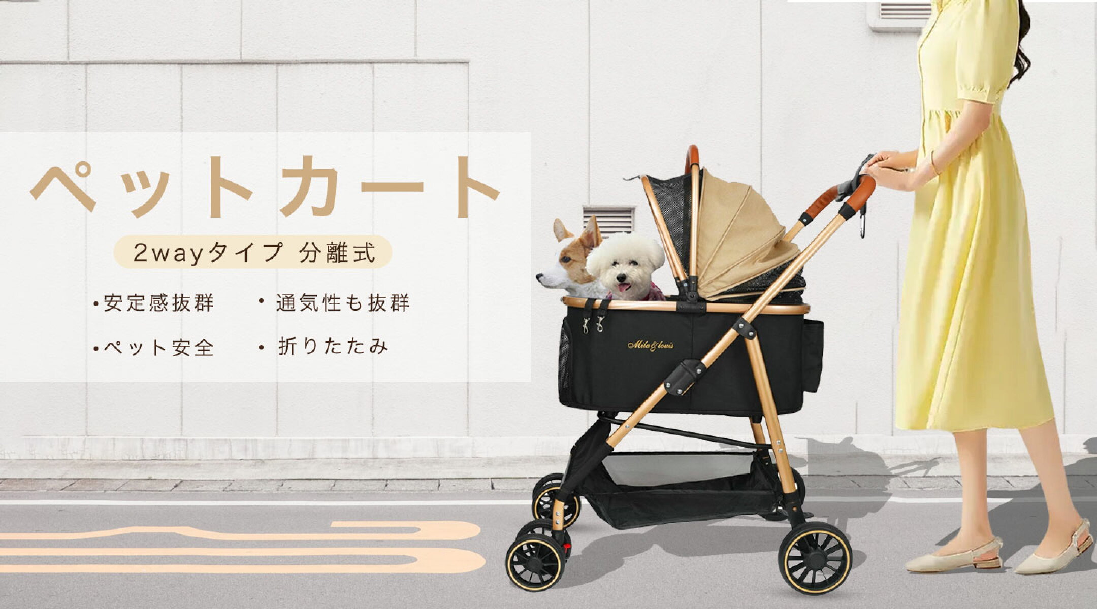 前輪360°後輪ブレーキ付 ゴールドボディをアップグレード カップホルダー フックなど付属【12日14時~全店舗2000円OFF+10倍ポイント】MILA&LOUIS ペットカート 犬 カート ペットバギー 多頭 小型犬 猫 中型犬一匹用 犬 カート分離 ワンタッチ 折りたたみ可能 犬 ベビーカー ドッグ バギー 軽量 犬 キャリー 折り畳み ペットキャリー