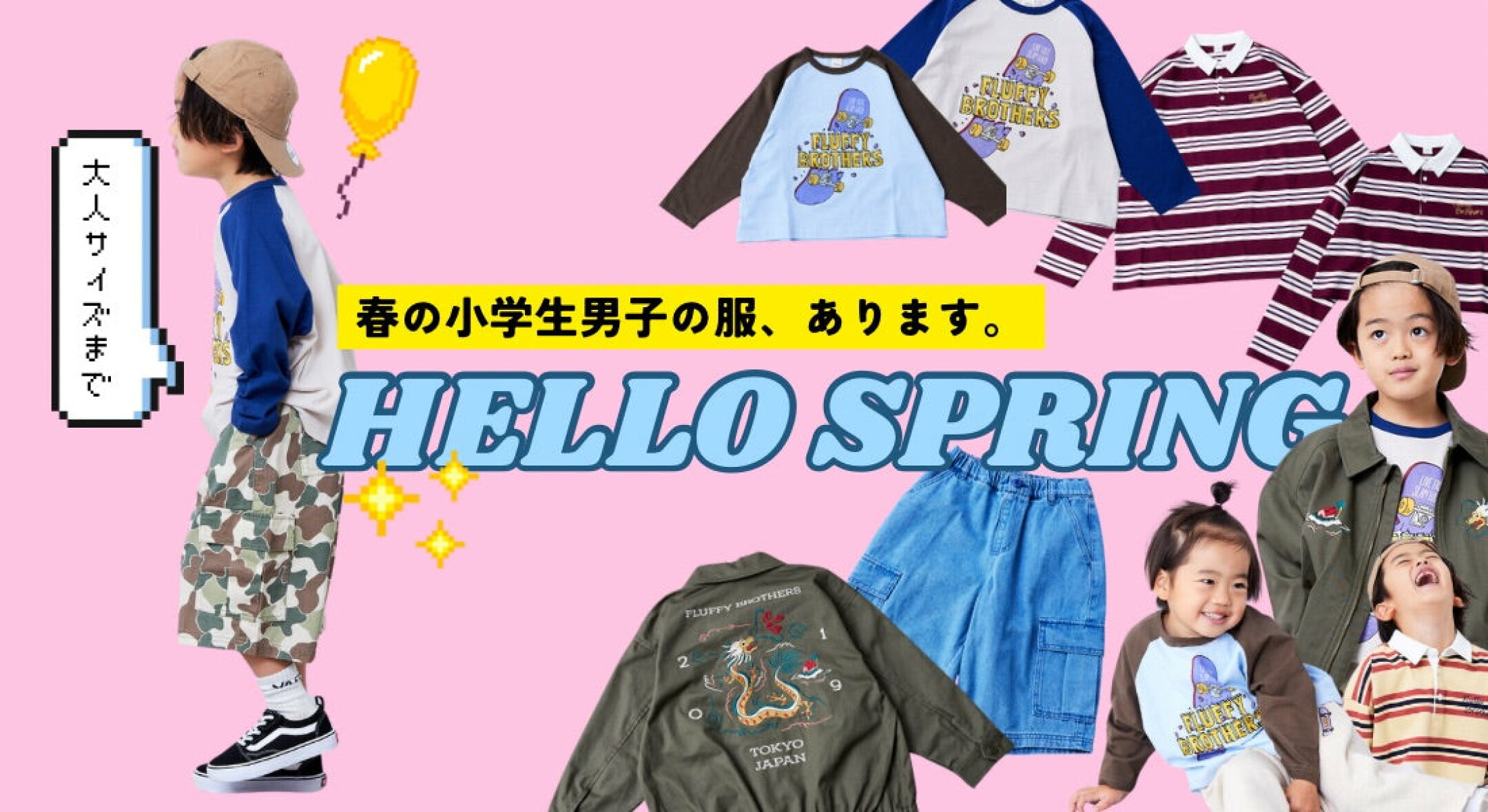 Fluffy BROTHERSは、“家族みんなが笑顔になるキッズ&ファミリーウェア”をコンセプトに、ベーシックなセレクトアイテムから遊び心あふれるオリジナルデザインまで、幅広く展開しています。 何を着たらいいか迷いがちな130cm以上の小学生のお子さま向けのアイテムも、たくさん取り揃えています。