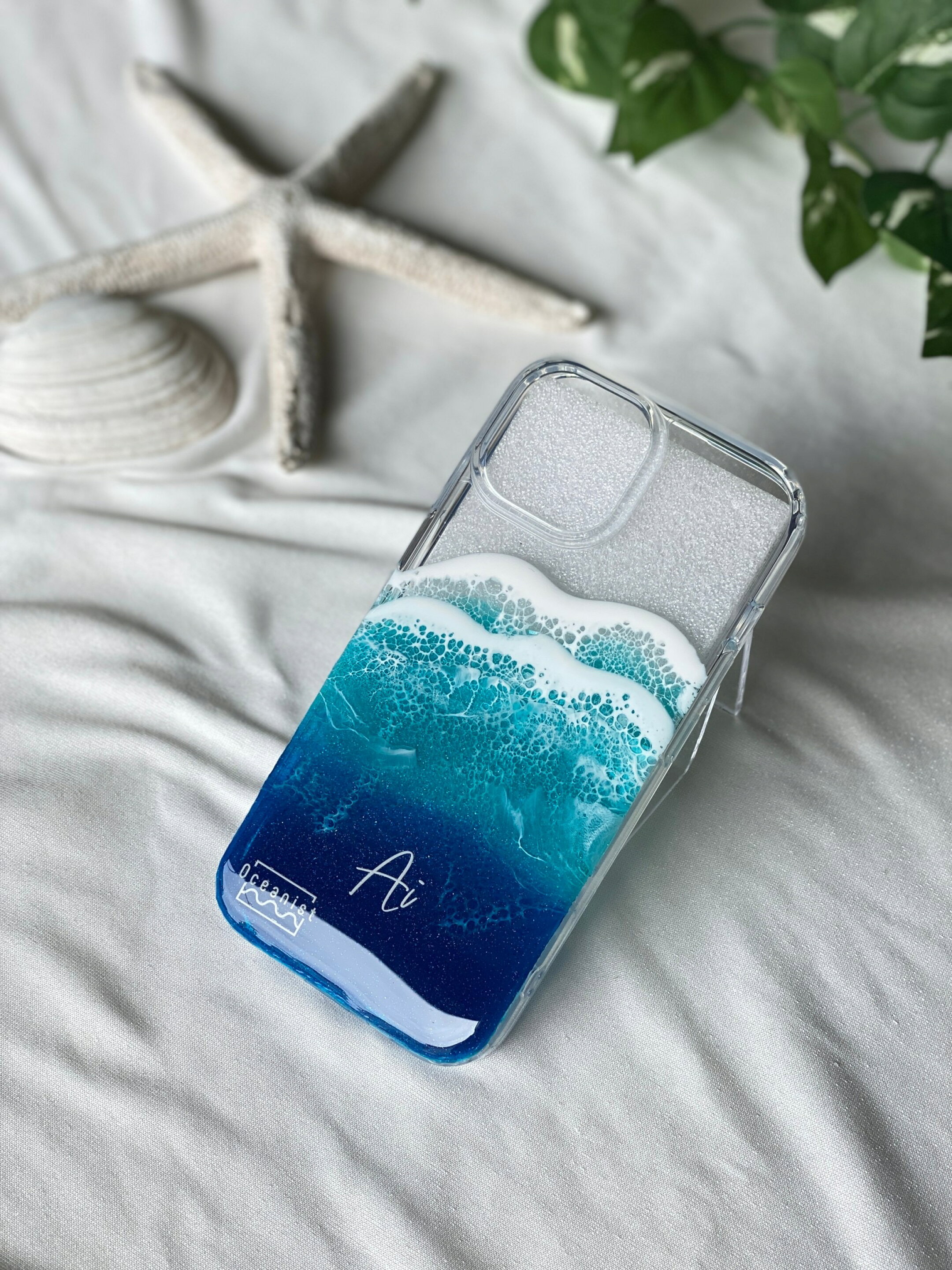 売約済【 オーシャンアート 】iPhone 14ミラーケース イラストブルー×エメラルド iPhone16 16pro 13mini 13promax iPhone17 iPhone17proスマホケース アイフォンカバー アイフォンケース オーシャン レジン oceanist 海 波 夏 雲 自然 ハワイ