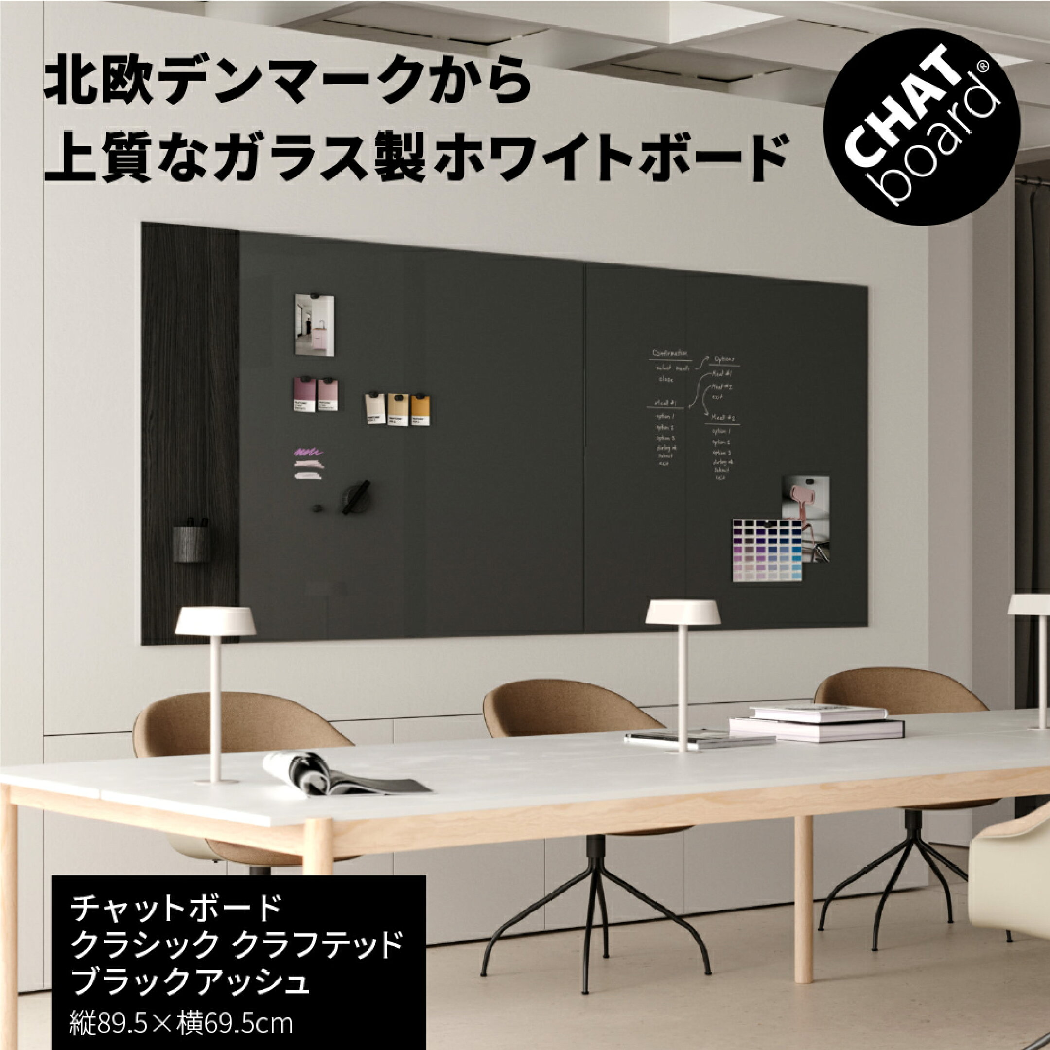 CHAT board(チャットボード)は、北欧デザインの美しさと機能性を兼ね備えたガラス製のホワイトボード。安全な強化ガラスで、書きやすく消しやすいのが特徴です。