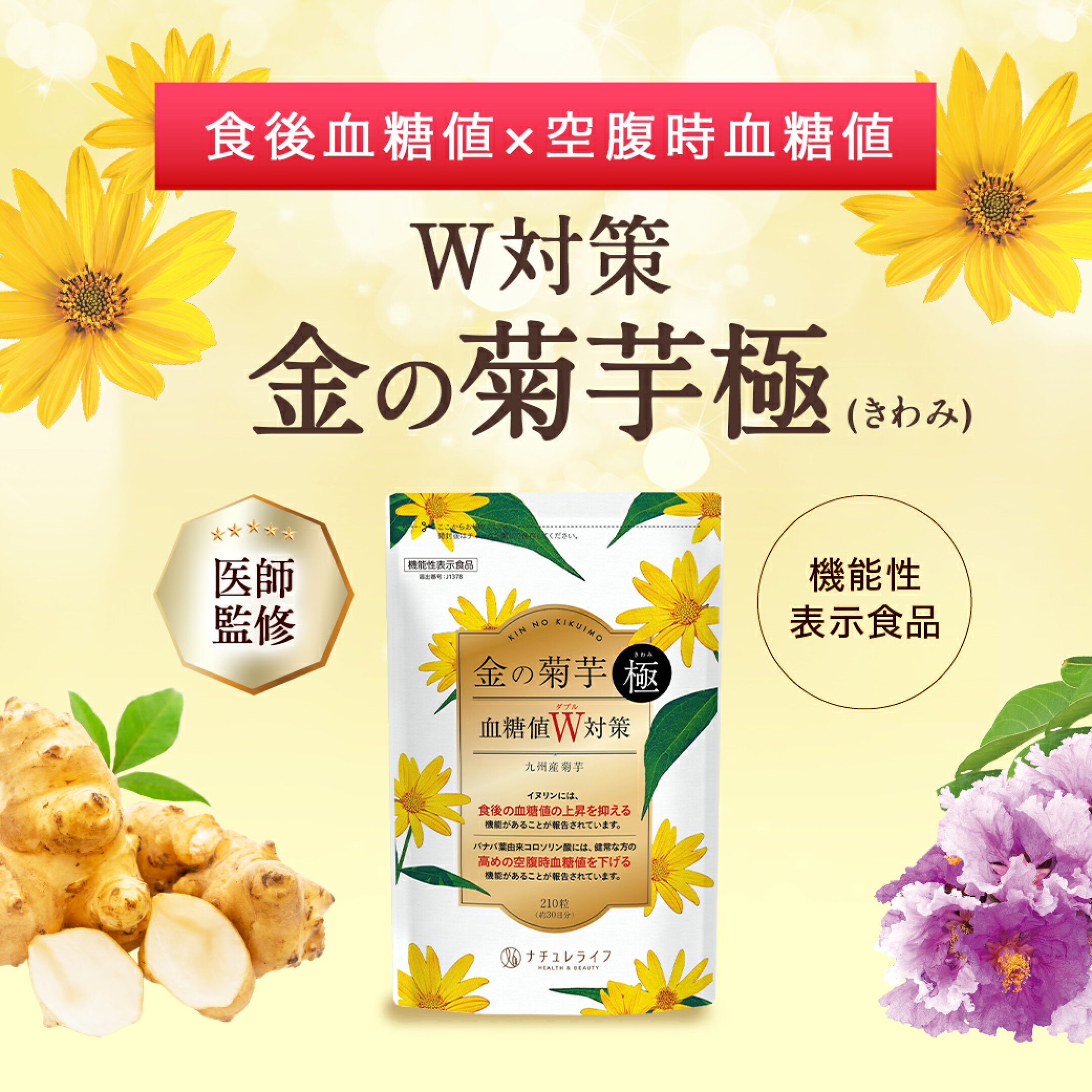 【医師監修×製薬会社の共同開発】空腹時血糖値 血糖値 下げる 金の菊芋 極 30日分(210粒) 機能性表示食品 サプリメント イヌリン バナバ葉由来コロソリン酸 糖質ケア 国産 菊芋 サプリ 血糖値サプリ 健康習慣 サポート 九州産 血糖値サポート食物繊維 GMP認定工場
