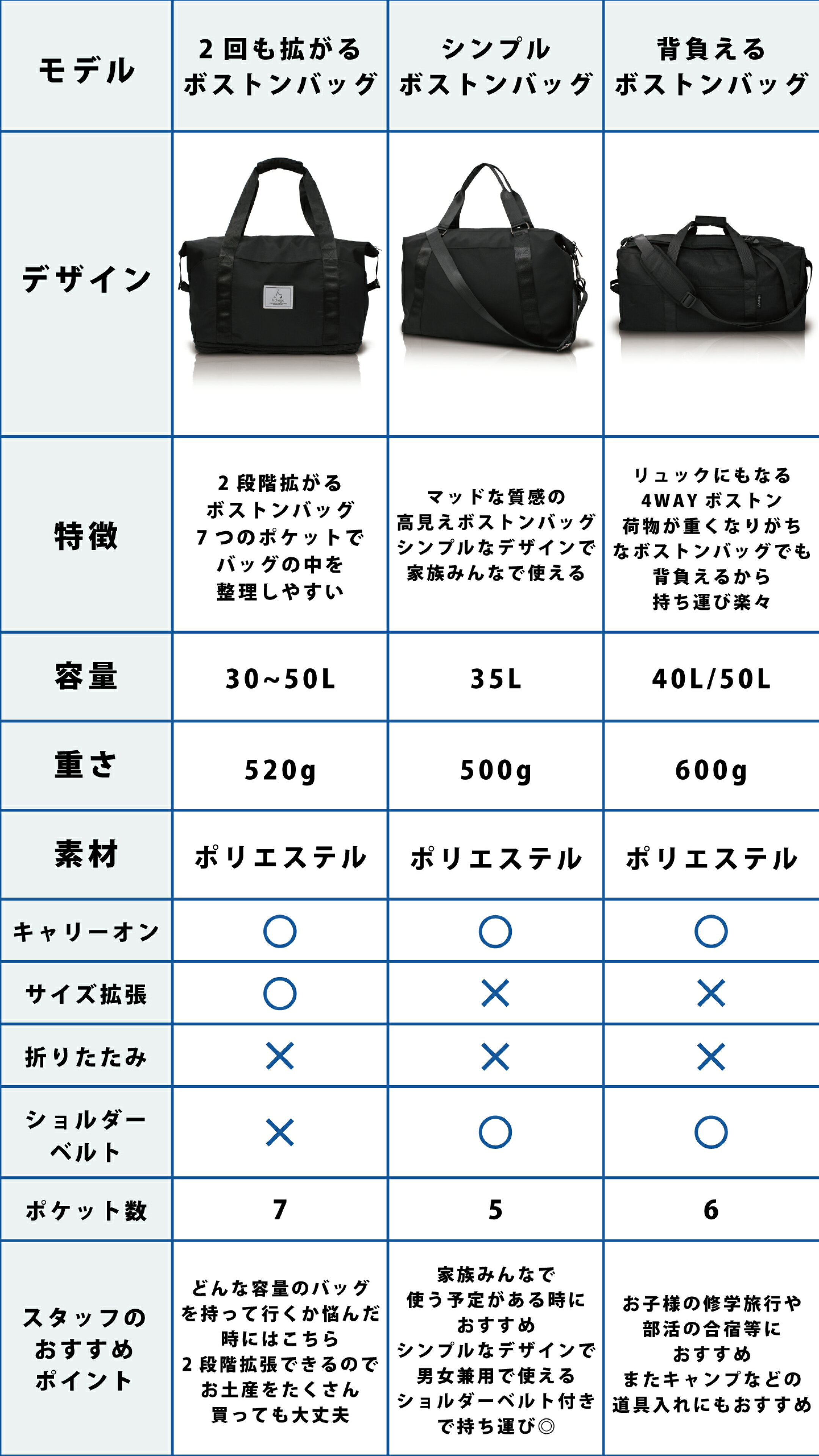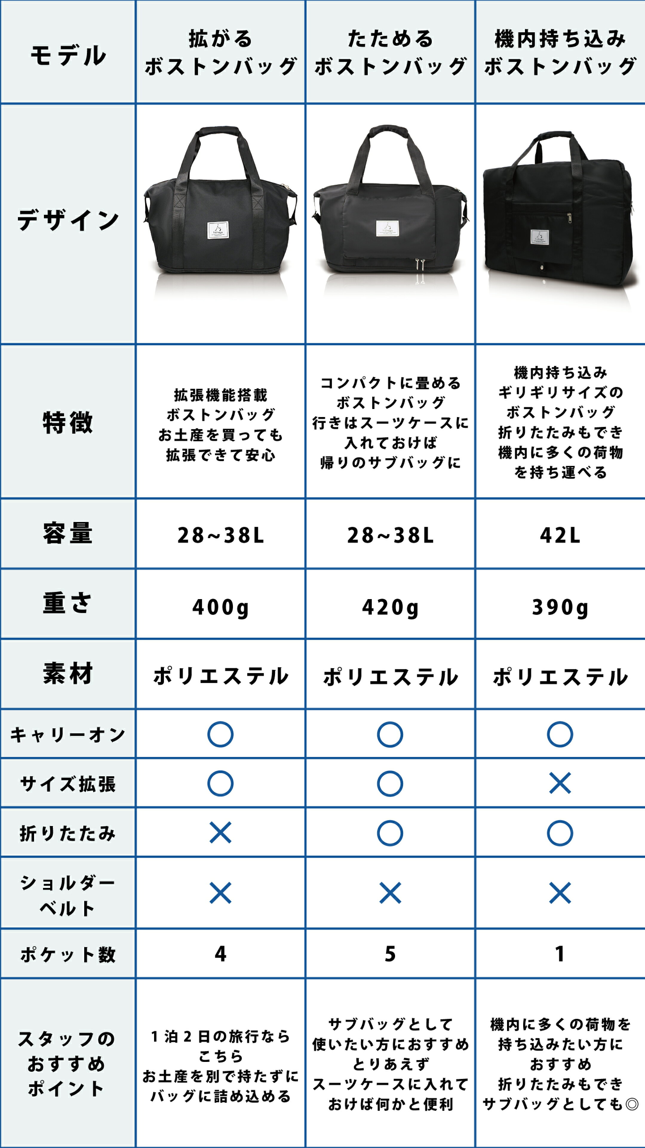 3.ボストンバッグ比較表