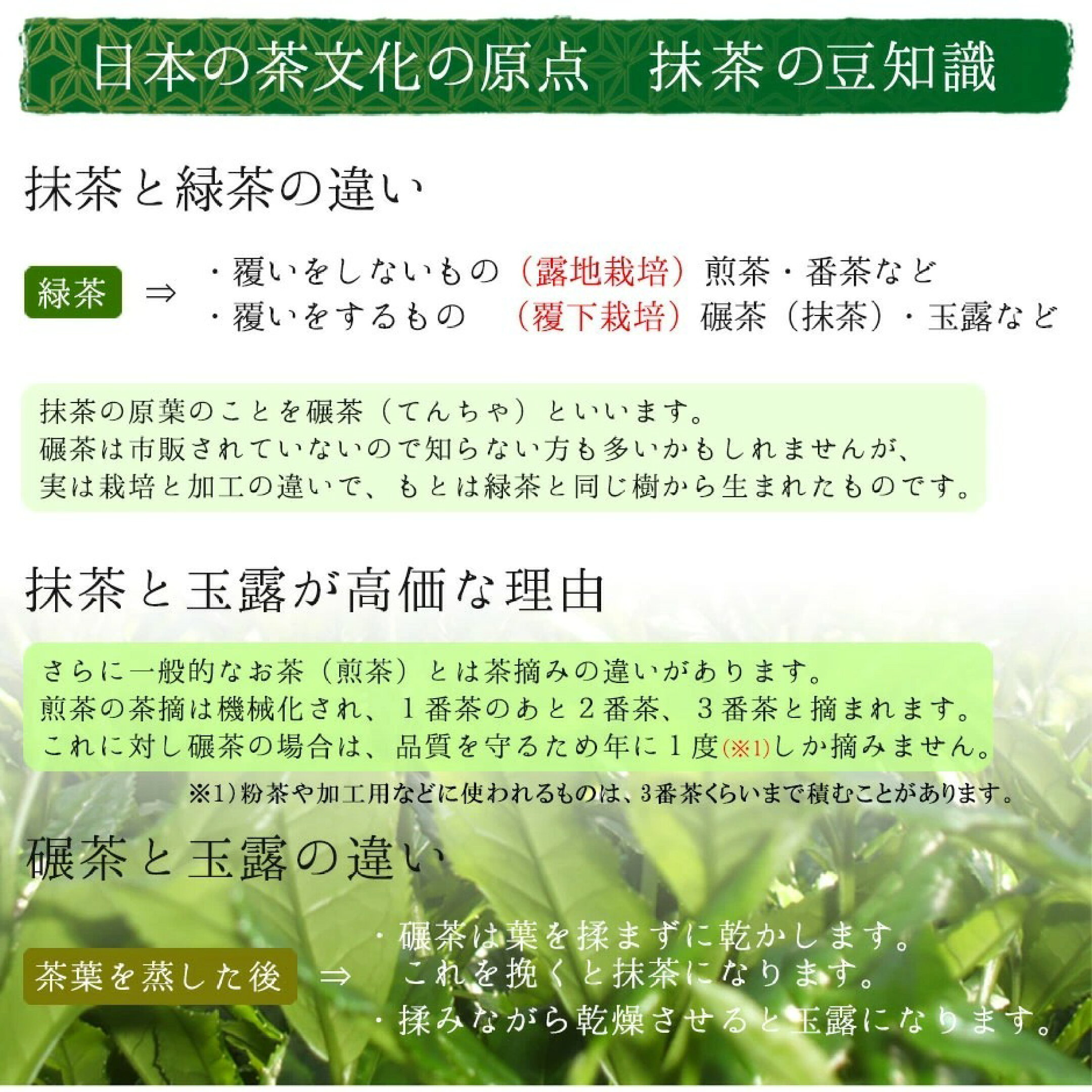 原材料は「緑茶」で統一されますが 栽培方法と製法によって名称が異なります。 覆下栽培…お茶の葉を摘む前に黒いシートなどで数十日間被せて日光を遮る技法(抹茶・玉露など) 露地栽培…覆いをせずに栽培します