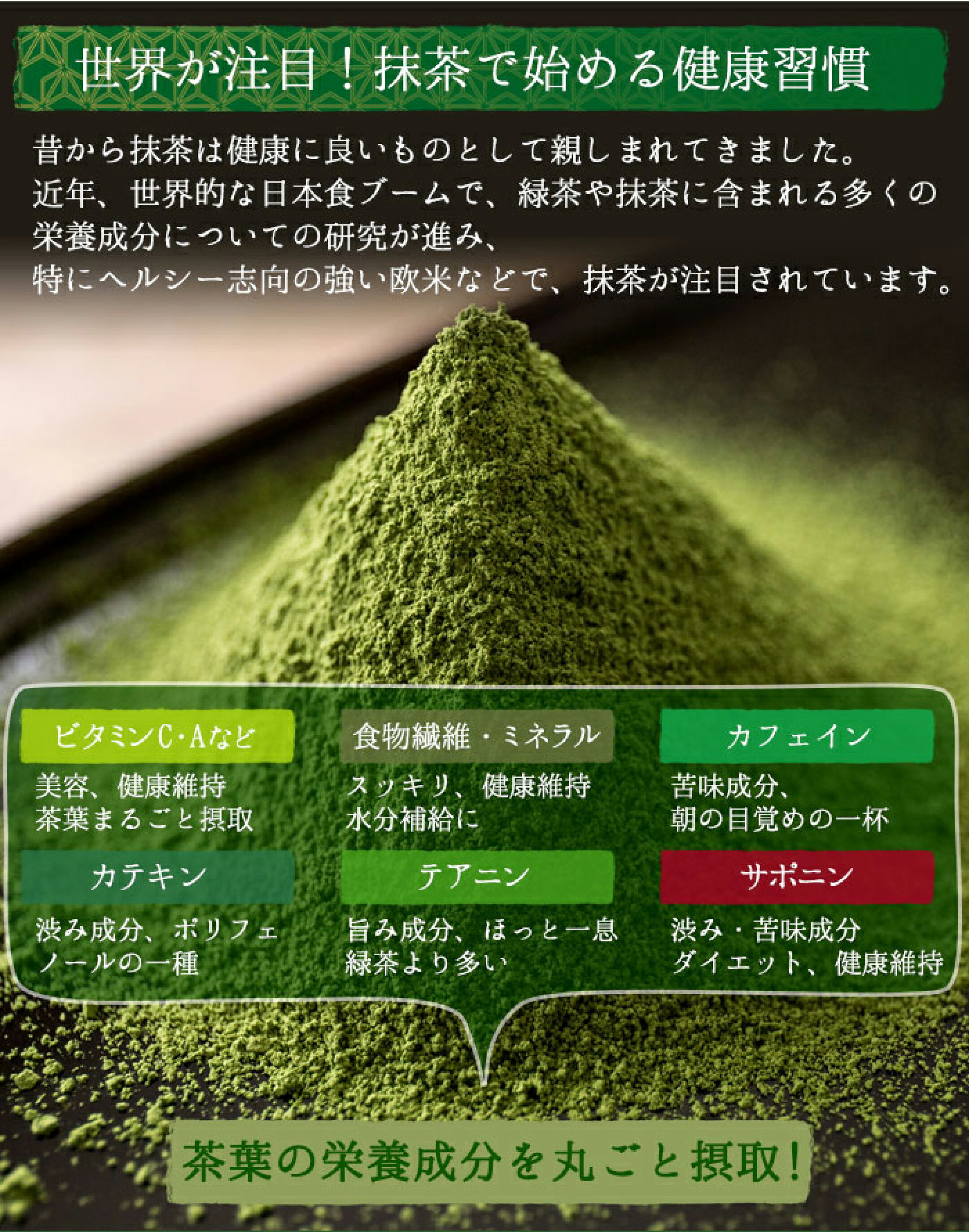 抹茶は、お湯で抽出(茶殻がでる)して飲むお茶と違い、茶葉をそのまま粉末化しているからこそ、水に溶けないビタミン類や食物繊維なども摂取できます。この粉末(抹茶)を飲むことで茶葉の栄養をまるごと摂取できます。海外においても、チアシードやアサイー、キヌアなどと並ぶ「スーパーフード」として注目されています。