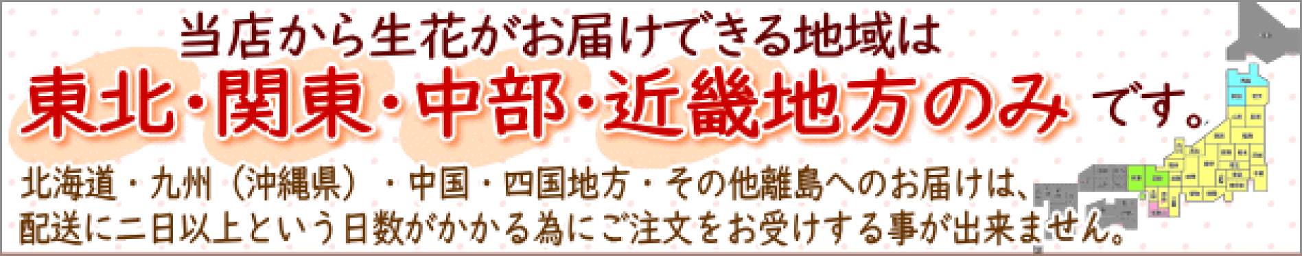 ★お届け可能地域 ====================== 生花のお届けは東北・関東・中部・近畿地方のみです。 北海道・中国地方・四国地方・九州地方・沖縄県、その他離島へお届けのご注文を頂いても、配送が出来ない為キャンセルとさせて頂きますのでご了承ください。また、海外への配送も現在はお受けしておりません。 ★キャンセルについて ====================== ご注文のキャンセルはお届け希望日の3日前までにご連絡下さい。3日前を過ぎてからのキャンセルはお受けすることが出来ません。 ★商品のお届け ====================== 商品のお届けは宅配便(ヤマト運輸)となります。 ご希望の到着日に合わせて発送いたしますので、ご指定は「買い物カゴに入れる」ボタンをクリック後の注文フォームにてお願い致します。 特に指定のない場合は、可能な限りの最短日程にてご用意致します。 お届けの予定はご注文確認のメールにてお知らせします。 宅配便でのお届けとなりますので、道路状況により遅延が発生する場合がございます。また、稀に配送中の事故も起こる可能性がございます事をご了承頂けますようお願い申し上げます。 ★返品について ====================== 商品が生花及び観葉植物の場合、基本的には返品はお受けできず、代品の送付もしくはご返金のいずれかでの対応となります。 (代品送付の場合の送料は、当店負担です。) 届いた時点ですでに枯れてしまっているもの、花が散ってしまっているものなど、明らかに異常が認められる場合には商品到着後直ちにお電話またはメールにてご連絡ください。 Tel 029-202-2081(10:00〜18:30) E-mail support@ivyberry-flowers.com 状態をお伺いし、その後の対応をご案内させて頂きます なお、「イメージと違う」などの理由では、代品送付またはご返金は受け付けられません。 生花以外のお品の場合は、着払いにて返品をお願いする場合がございますが、まずは上記の電話番号もしくはメールアドレスまでご連絡下さい。連絡なしの返品は、お受け出来ません。 なお、受け取り拒否や転居等のお届け先不明の場合は、商品不達でも商品代金はお返しできません。発送後のキャンセル・返金もお受けできません。