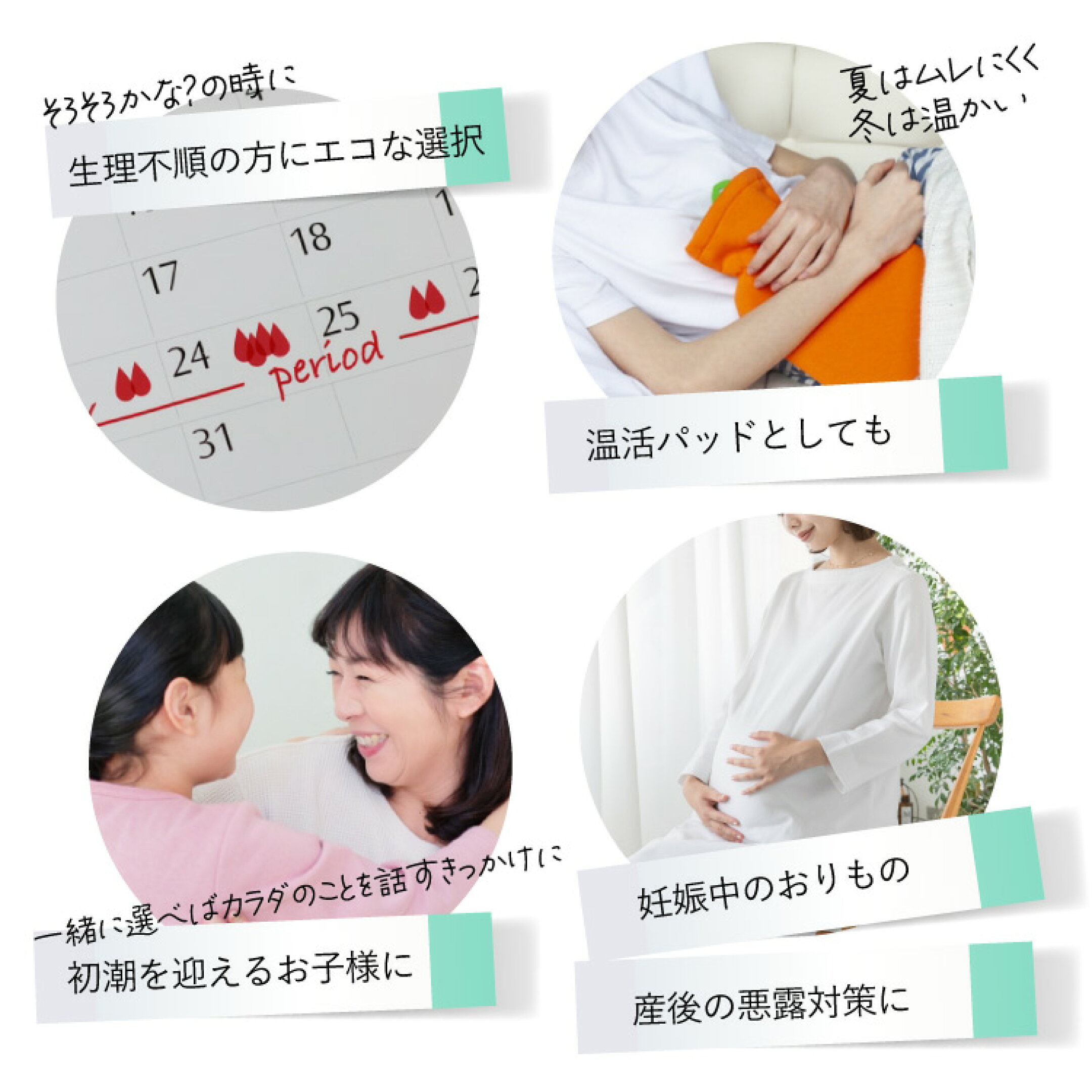 「布ナプキン=生理用」のイメージがありますが、生理以外に使われる方もたくさん。冷えを感じるときに温活パッドとして活用できます。ふわふわの起毛ネルを重ねているので、身に着けているだけでもぬくもりを感じます。