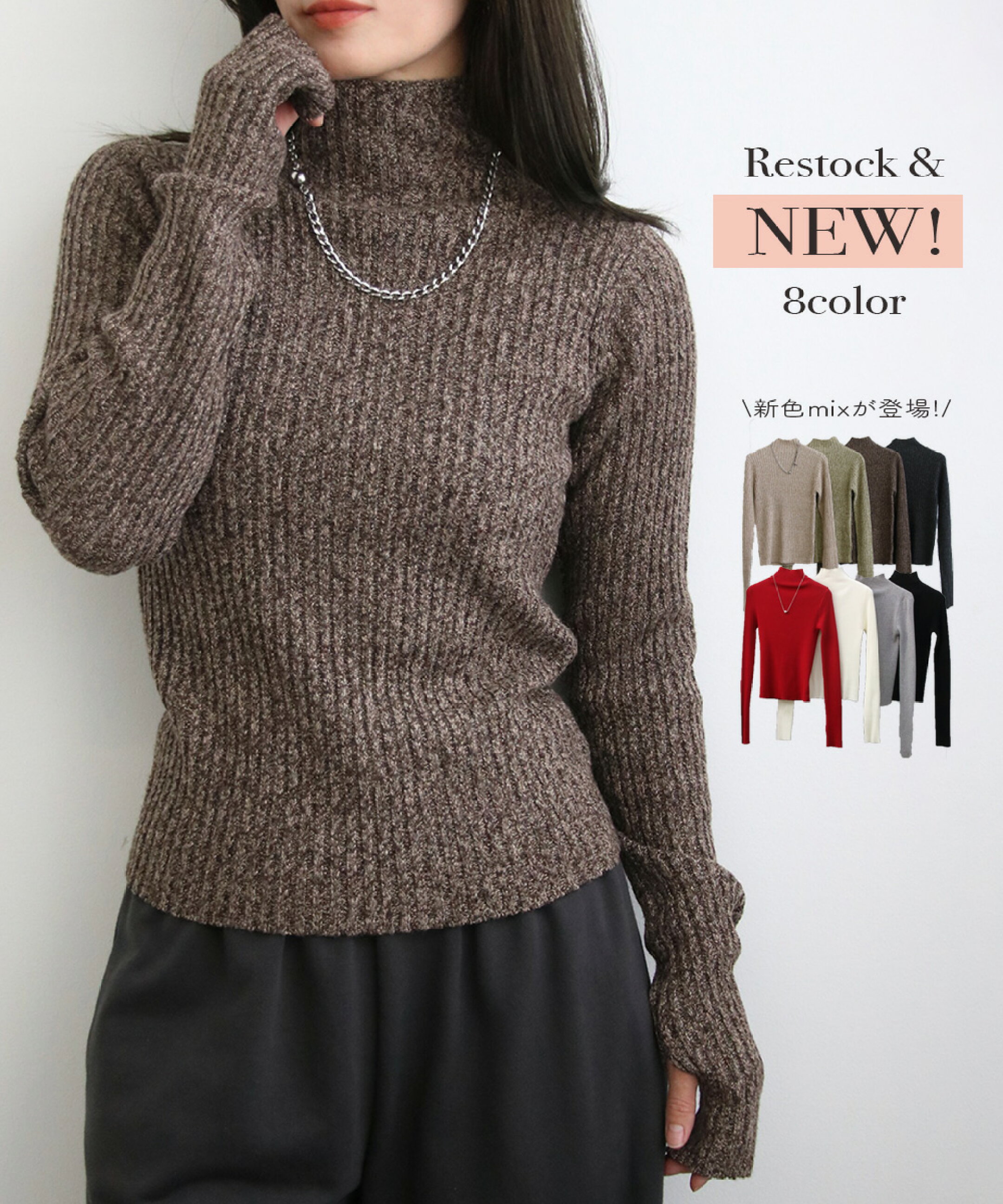 【新色登場!】サムホールリブニットプルオーバー 選べる 2素材 柔らか ニット ハイネック セーター 指抜き 親指 【単品でメール便可】長袖 トップス ニット リブ織り シンプル オフィス カジュアル タイト インナー 秋冬 プチプラ カラバリ 防寒 赤 白 黒 グレー リブ