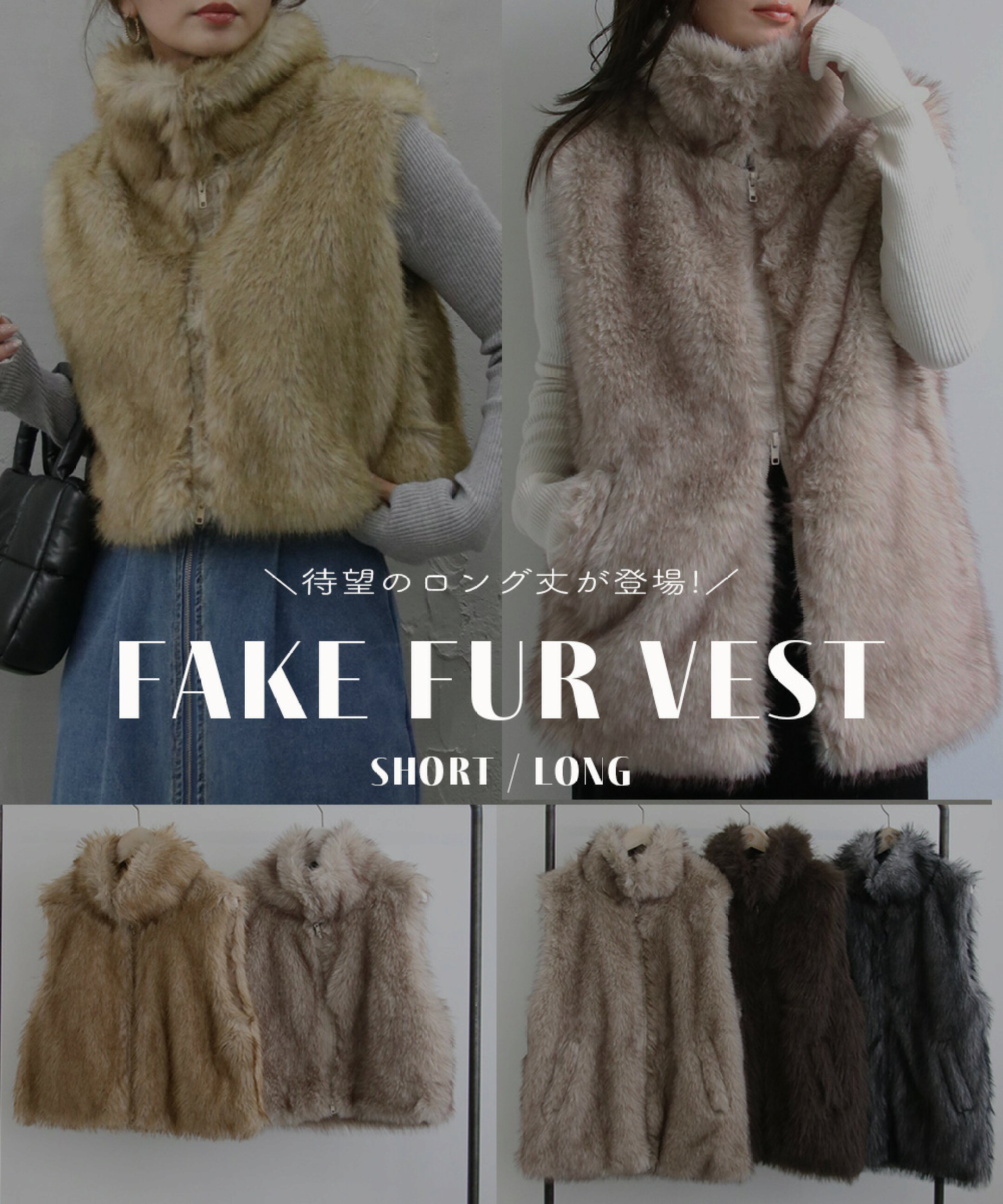 【新色登場当店人気商品】フェイクファーショート丈ベスト 選べる2丈 ショート丈 ロング丈 フェイクファー ジレ ベスト クロップド ジップアップ ダブルジップ トップス ライトアウター ジレ ショート丈 ロングファーベスト 暖かい 柔らか レディースファッション