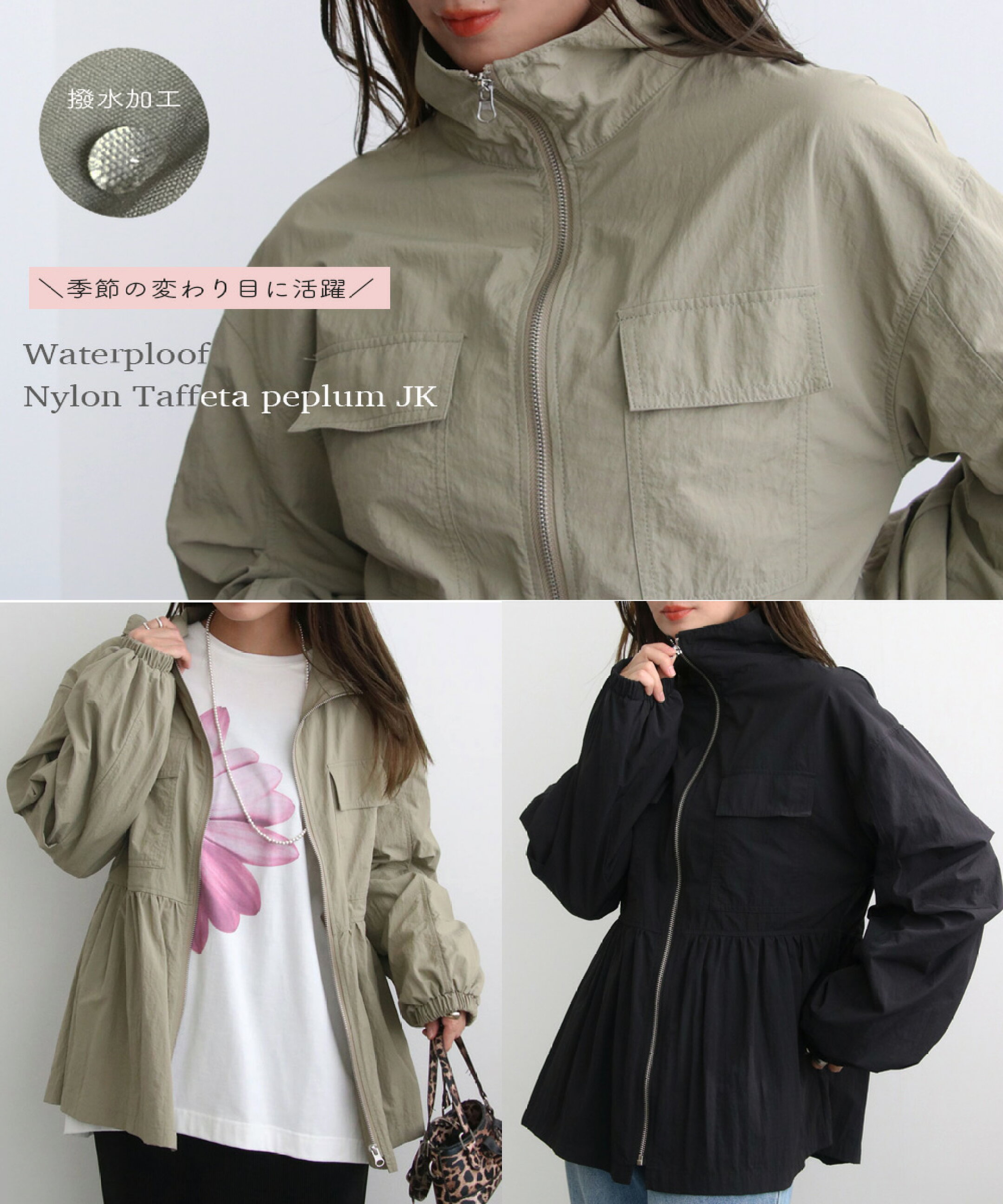 【2025秋新作】タフタペプラムギャザーブルゾン 軽量 洗える ウォッシャブル 防風 ジャケット ぽわん袖 ナイロン ハイネック スタンドカラー ライトアウター 秋冬 春 フレア シルエット ビッグポケット 長袖 ナイロンジャケット アウター 羽織り
