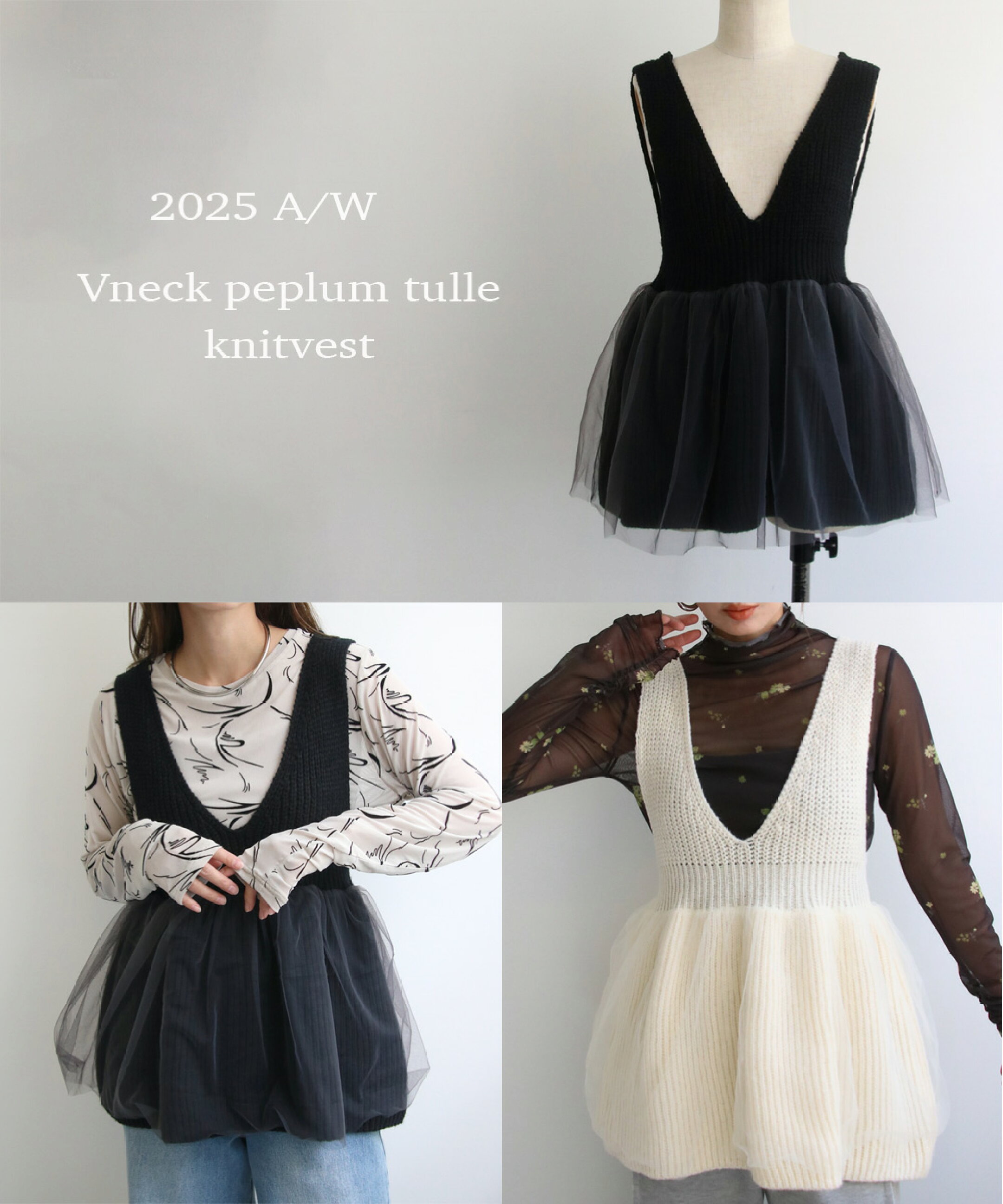 【2025秋新作】Vネックペプラムチュールニットベスト 異素材 レイヤード Vネックニット ペプラム ふんわり Aライン トップス ニット セーター スッキリ ノースリーブ チュール ベスト 体型カバー レディースファッション