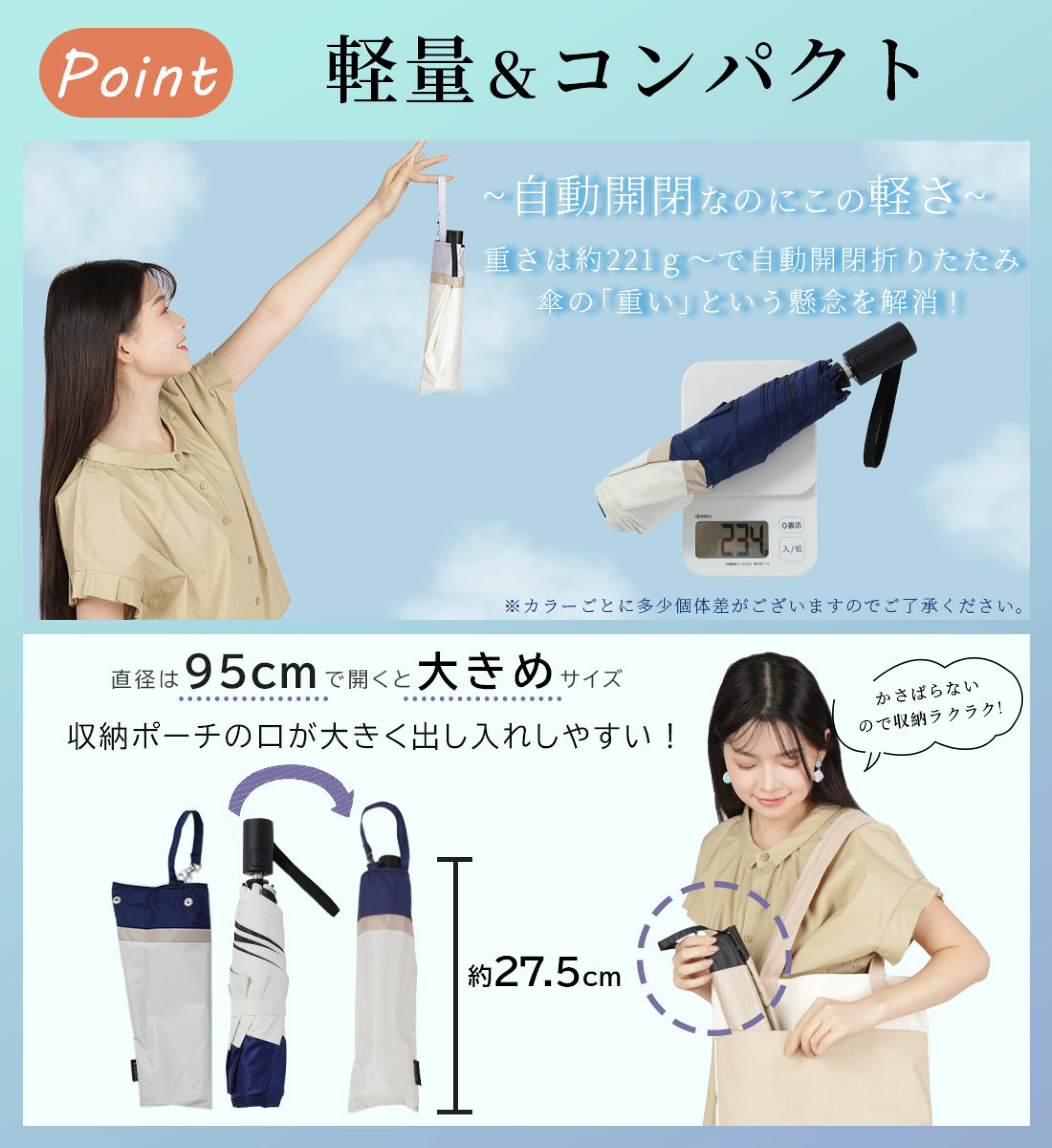 日本特許取得 超軽量カーボン 自動開閉日傘 開閉はボタンを押すだけのワンタッチオープン・クローズ。両手が荷物で塞がっている時や車の乗り降り時など、軽く開閉ボタンを押すだけで開閉できますのでとても便利です。 カーボンファイバーと高密度ポリエステル繊維生地の組み合わせで、自動開閉傘でも約240gの重量を実現しました! ▼対象商品はコチラ▼