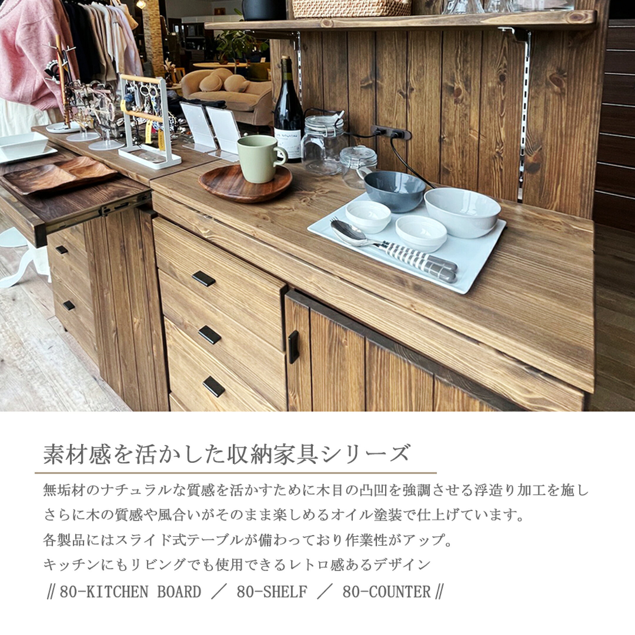 カウンター キッチンカウンター 背面化粧仕上げ 幅80 オープンボード 家電置き レンジ台 木製 カップボード 作業台 コンセント付き モイス付き スライドカウンター ブラウン ナチュラル 間仕切り キッチン収納 国産 北欧 シンプル 開梱設置