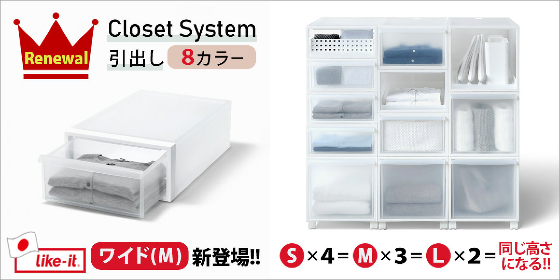 収納ケース[クローゼットシステム 引出し S M L ワイドM ] 日本製 積み重ねOK スタッキング時浮き防止機能 引出し抜け落ち防止機能 プラスチック CS-D1 CS-D2 CS-D3 CS-WD2 ホワイト ブラック ベージュ グレー ピンク モカ [ライクイット] 【ポイント2倍】【e暮らしR】