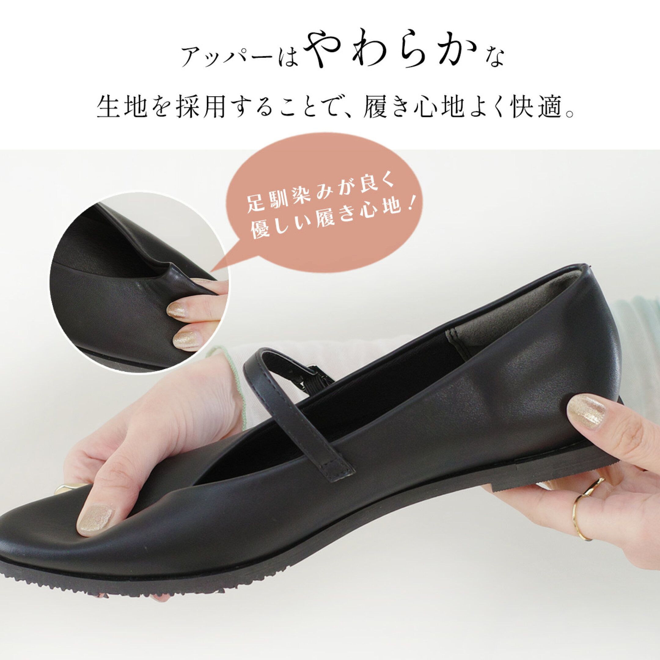 さりげないコバでモードな印象に。 柔らか素材のアッパーとかかとクッション付きで快適な履き心地にこだわりました。 ソールは滑りにくく、屈曲性が良く足への負担を軽減してくれます。 ローヒールながら足細効果のある細身シルエットも魅力です!