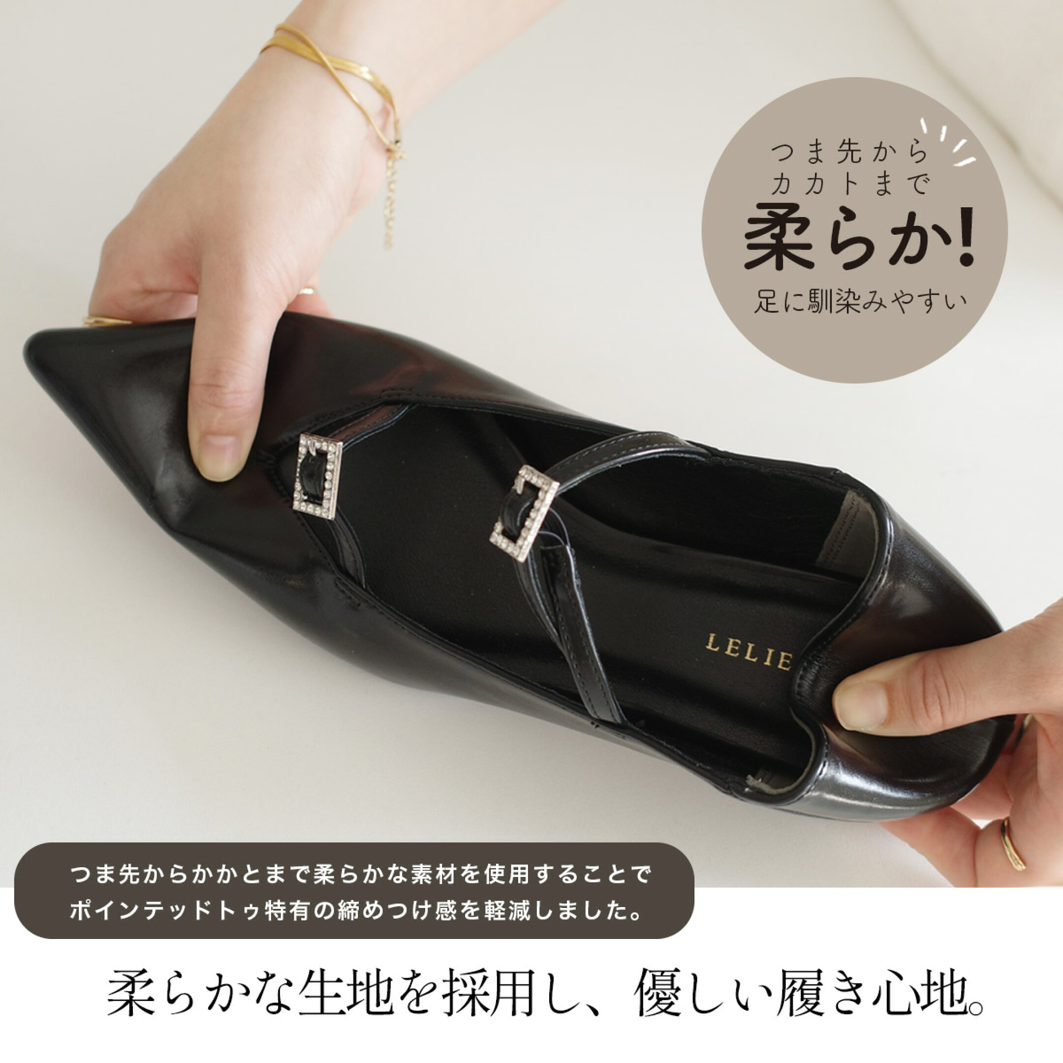 大人っぽく華やかなラインストーンがコーデのアクセントに。 柔らかな生地を採用し、優しい快適な履き心地。 「楽ちんなのにモードに仕上がる」 つま先からかかとまで柔らかな素材を使用することで、ポインテッドトゥ特有の締めつけ感を軽減。